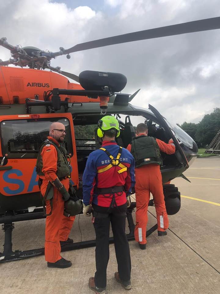 In Erftstadt wurde mit Hubschraubern ein vom Hochwasser eingeschlossenes Krankenhaus evakuiert. Dabei wurden auch rund 40 Betroffene von den Luftrettern der Rotkreuz-Bergwacht mit der Winsch zum Hubschrauber gezogen und in Sicherheit gebracht.