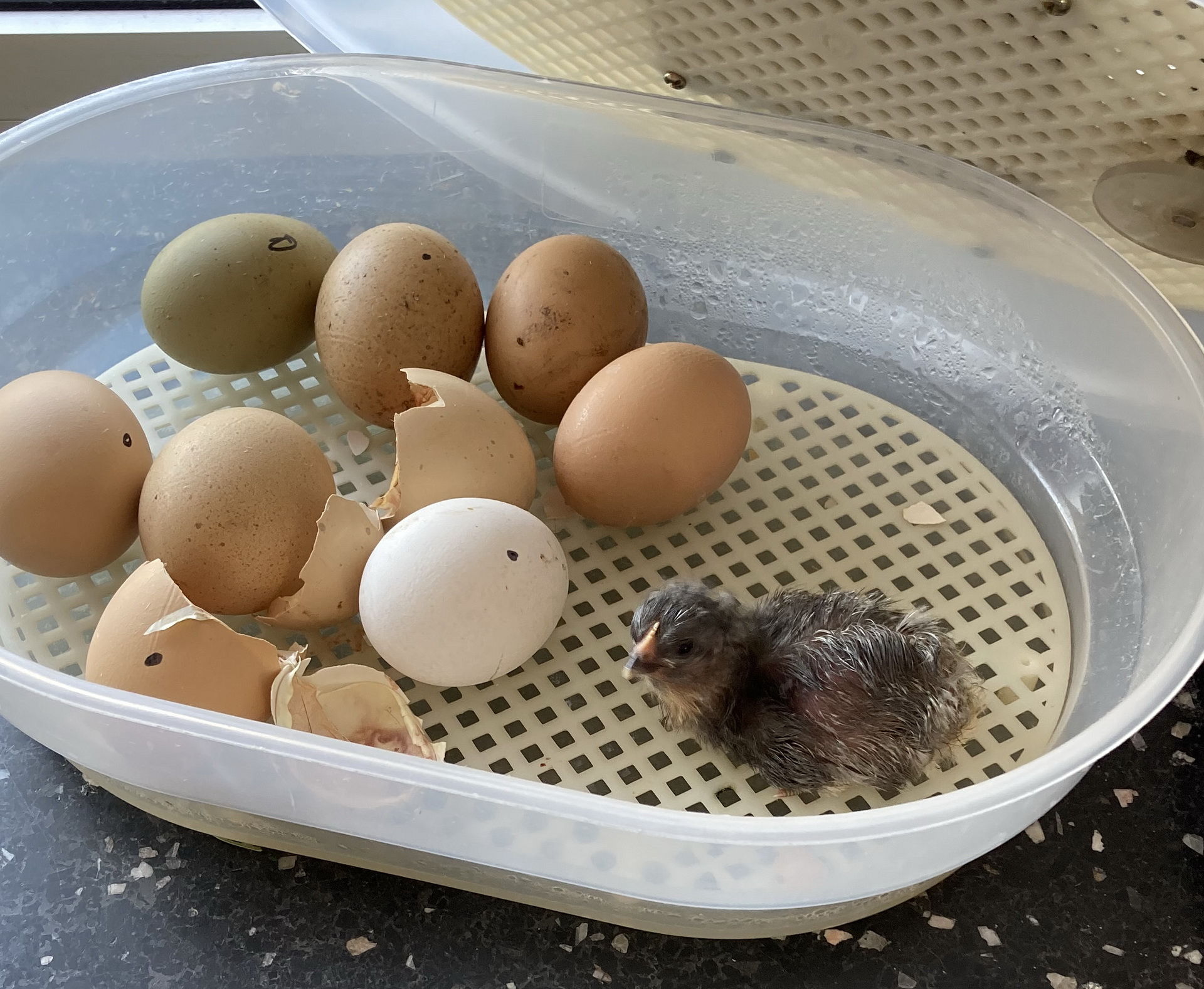 Wissbegierig wurden die Eier mit der Taschenlampe untersucht und dann dem Brutkasten überantwortet. Nach 21 Tagen spannenden Wartens begann dann das erste Küken, seine Eierschale zu durchbrechen, und die Kinder konnten dabei zusehen.