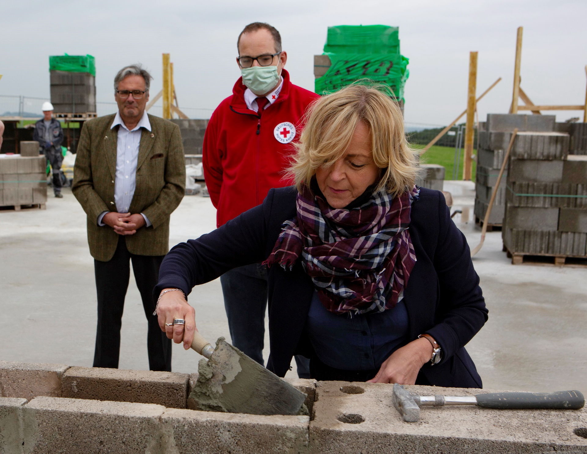 Eine mit Zeitungen, Münzen, Urkunde und Spielzeug-Lkw gefüllte Kunststoffröhre im neuen Rotkreuz-Kindergarten Mahlberg eingemauert