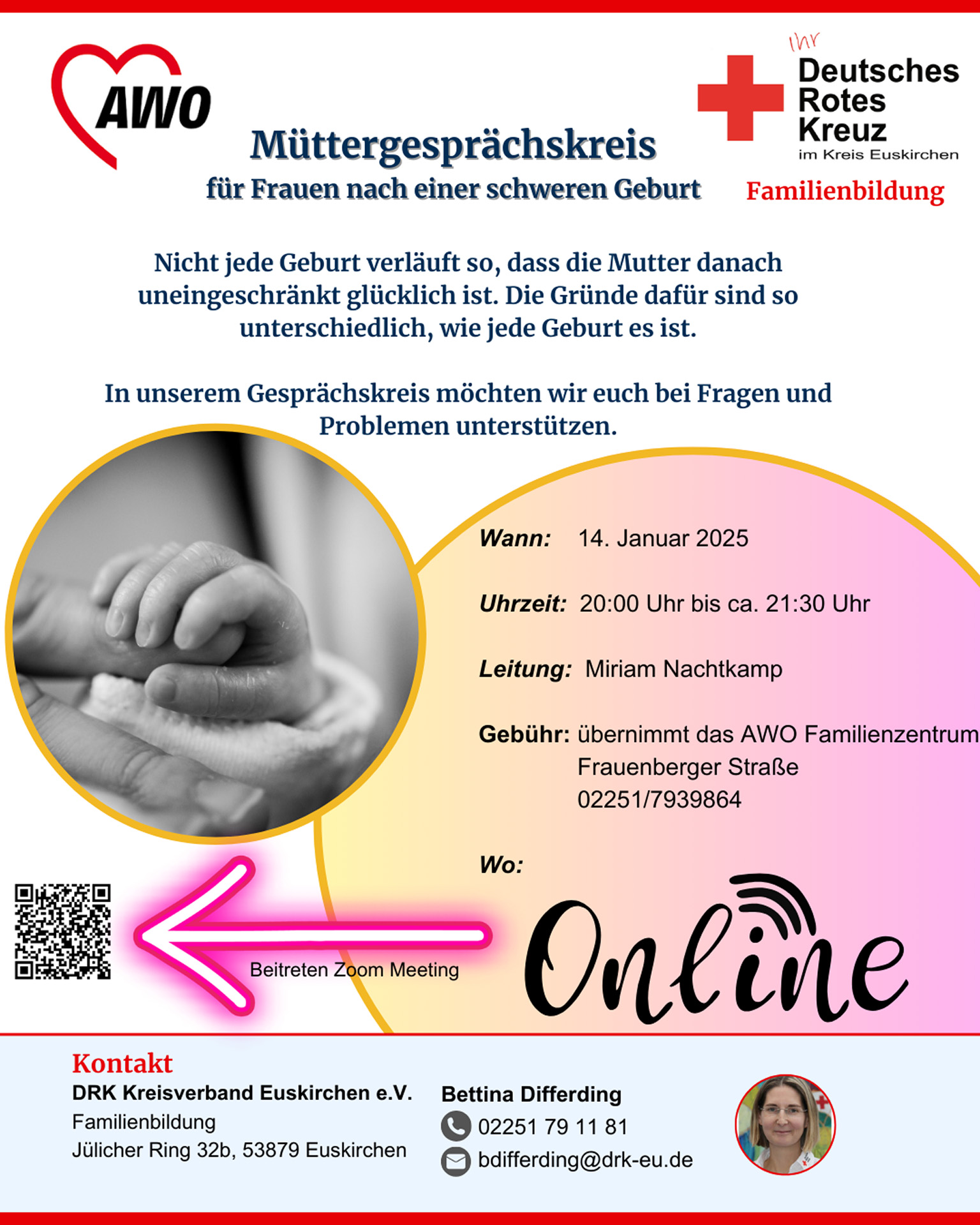 Der Bereich Familienbildung bietet auch 2025 eine Vielzahl an Angeboten für junge Familien. Neben bewährten Kursen wie „Elternstart NRW“ und Krabbelgruppen gibt es zwei neue Gesprächskreise für Mütter und Väter nach einer schweren Geburt. Diese Online-Treffen schaffen einen geschützten Raum für Austausch und Unterstützung in einer oft herausfordernden Lebensphase. „Wir wissen, wie wichtig es ist, dass Eltern sich verstanden und gehört fühlen. Diese Gesprächskreise sind ein wichtiger Schritt, um betroffenen Familien zur Seite zu stehen“, betont Heike Iven, Leiterin der Familienbildung. Das gelte auch für Eltern von Sternenkindern, denen das DRK-Angebote unterbreitet, um den Verlust des Kindes und die Trauer zu verarbeiten.
