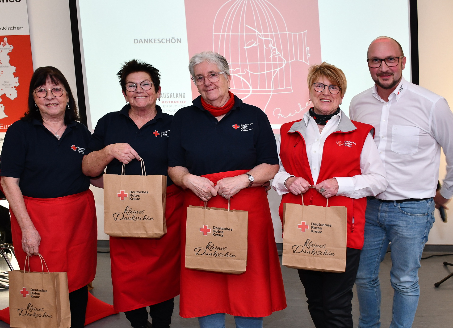 Die Jahresabschlusskonferenz wurde auch zur Verabschiedung bewährter Dozenten in der Rotkreuz-Familienbildung genutzt. Rolf Klöcker, Familienbildungswerkchefin Heike Iven und Patrick Dost sagten Marion Radermacher Danke, die seit fast 25 Jahren im Bereich der Eltern-Kind-Arbeit aus- und fortbildet. Auch Patrick Dost, der Chef der Aus- und Fortbildung, Familien- und Seniorenarbeit des DRK, war bislang noch immer auch als Übungsleiter für Aquagymnastik unterwegs und wurde von Akademieleiter Daniel Larres geehrt und als Dozent verabschiedet.