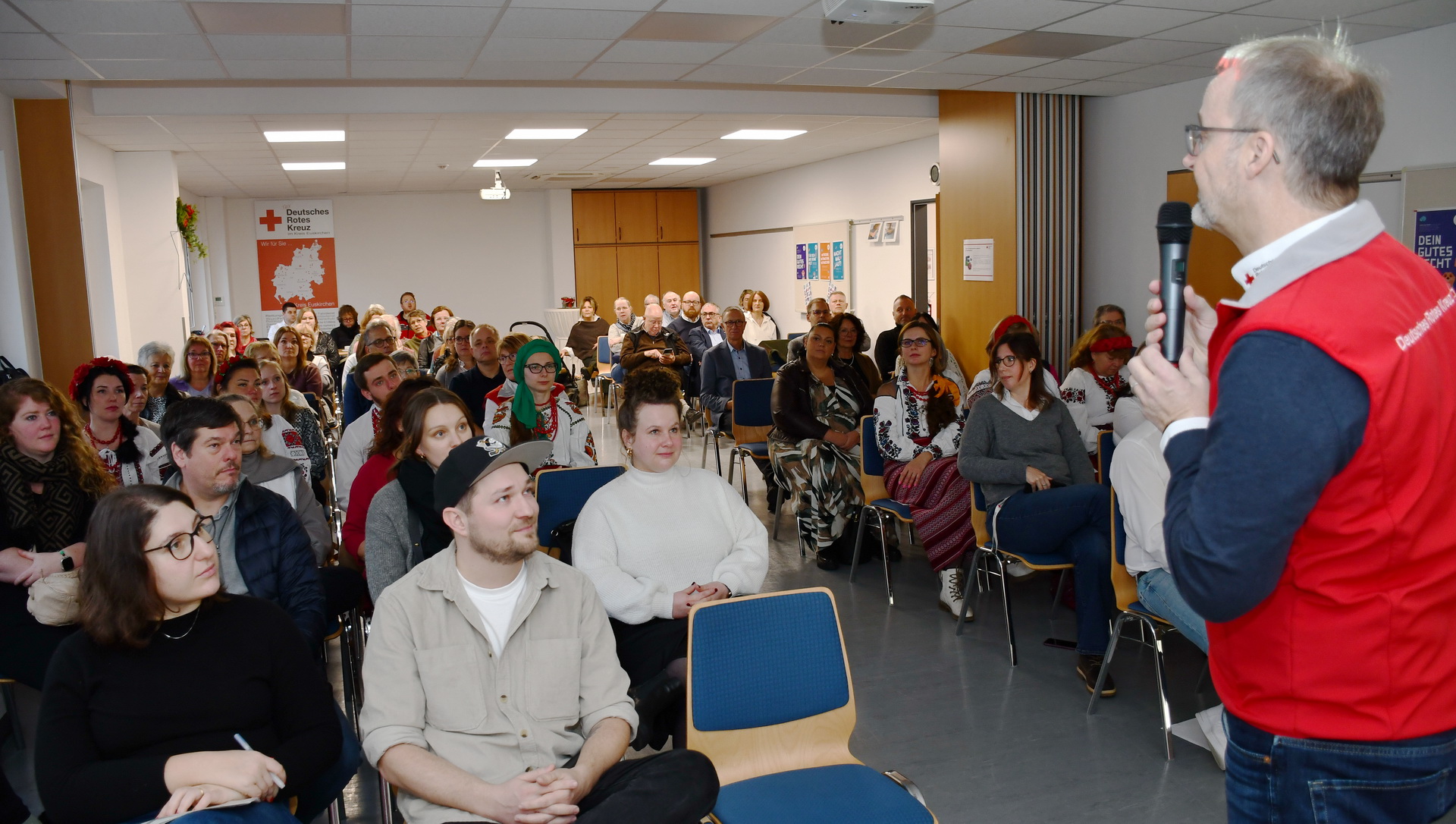 Der Bereichsleiter für Aus- und Fortbildung, Familien- und Seniorenarbeit des DRK im Kreis Euskirchen und dessen Geschäftsführer Rolf Klöcker konnten zahlreiche Institutionsvertreter aus dem Kreisgebiet, vor allem Erzieherinnen und Erzieher, Rotkreuzangehörige, AOK-Chef Helmut Schneider, Guido Otten von der Barmer und Bürgermeister Ulf Hürtgen begrüßen.