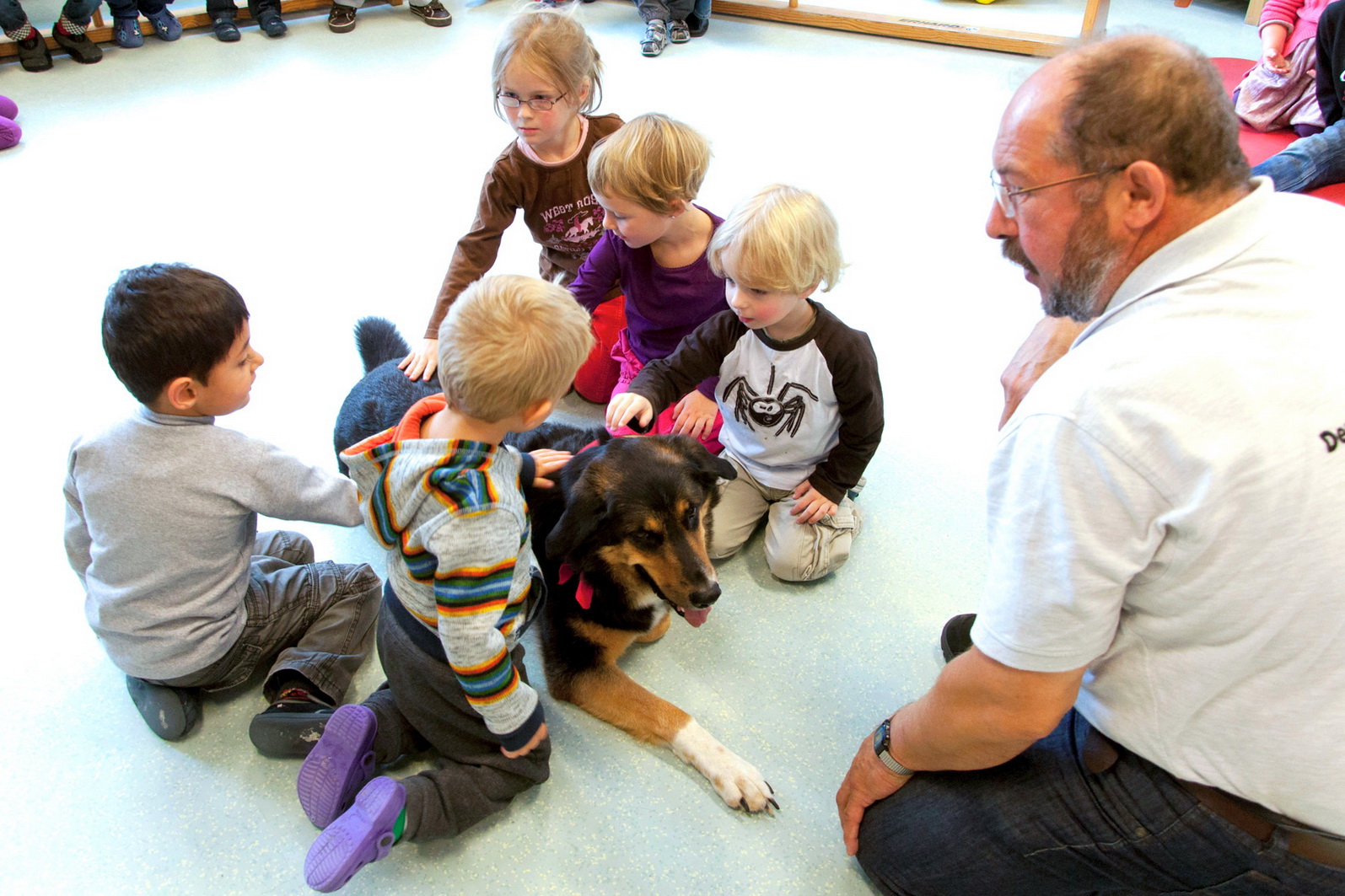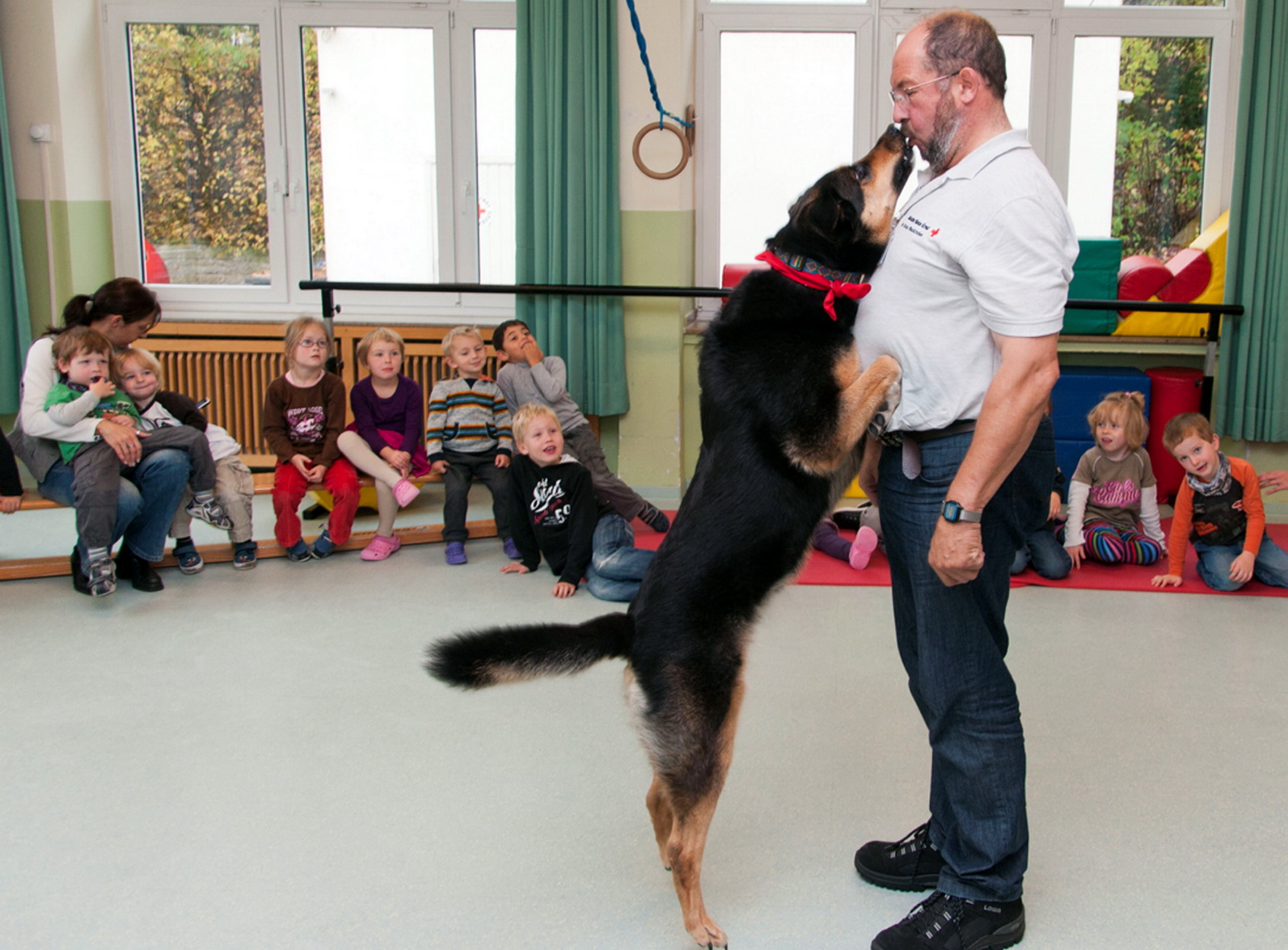 Spielerisch lernten die Kinder während des Besuchs, dass Hunde vor allem wegen ihres überragenden Riechorgans für den Menschen so wichtig sind. Praktische Tipps, etwa wie man sich einem Hund nähert („Niemals von hinten.“) rundeten den Besuch Lenas ab. Auch lernten die Kindergartenkinder, wie man einen Hund füttert. Hierbei bewies Lena den richtigen Spürsinn und fand alle in den Händen der Kinder versteckten Hundekekse.