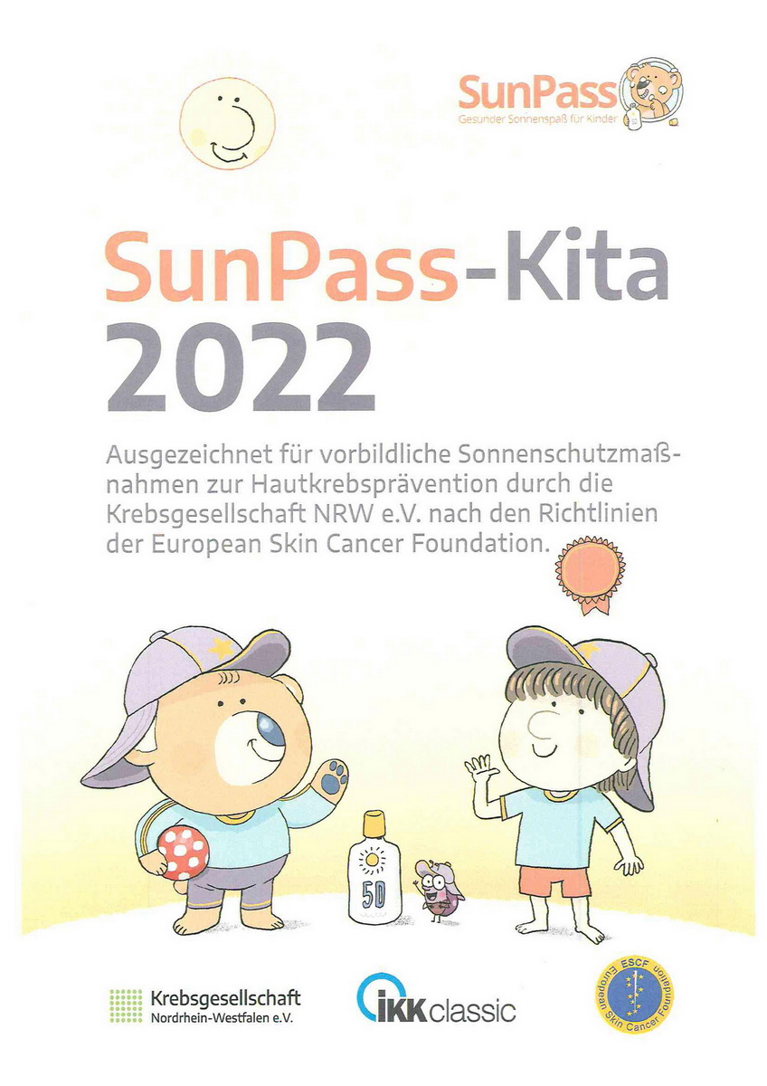 „Um das zu erreichen, orientieren sich alle teilnehmenden Kitas an einer Sonnenschutzvereinbarung mit festen Verhaltensregeln zum Sonnenschutz “, so Clemens Lorenzo Garea von der „Krebsgesellschaft NRW“: „Erst wenn alle Vorgaben erfüllt sind, erhalten die Kitas die Auszeichnung »SunPass-Kita«. Und die ist nicht so leicht zu bekommen. Sie müssen viele Maßnahmen zum UV-Schutz aktiv und nachhaltig umsetzen: Spielerisch für die Kids, informativ für Erzieher und Eltern, analog vor Ort und in Pandemiezeiten auch digital.“