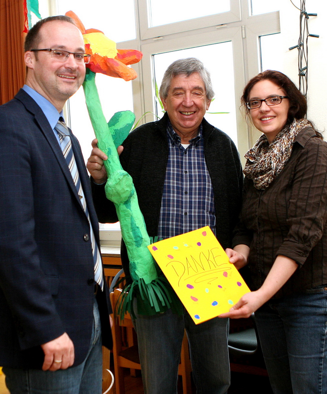 Die Kinder dankten ihm mit einem Ständchen, einer Karte und einer selbstgebastelten Blume.