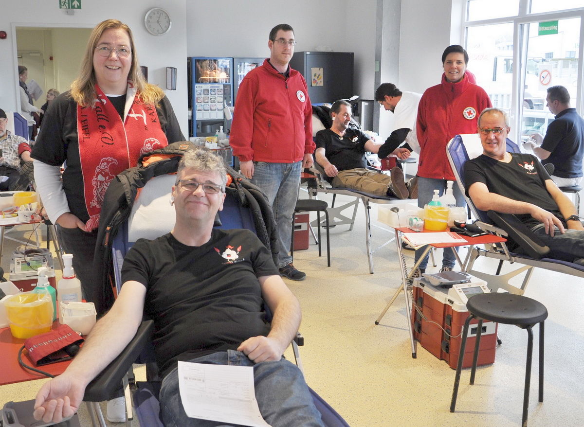 Kall | Dieses Mal fand der Aderlass-Termin des DRK in Mechernichs Nachbargemeinde Kall außerhalb der Karnevalszeit statt – Das „Federwölkchen“-Dreigestirn erschien deshalb im zivilen Shirt zum Blutspenden, um für die gute Sache zu werben