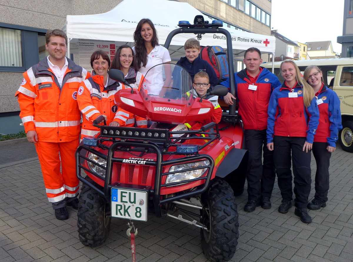 Außerdem hatte der Aufbautrupp um Daniel Hermanns und Rolf Zimmermann den erwähnten „Arctic Cat“ an der Rotkreuzstation im Innenhof des BBK aufgebaut. Mit dem Gefährt sind die Helfer im Winter im Ski- und Rodelgebiet rund um Udenbreth, im Sommer im Nationalpark Eifel von der Rettungswache Vogelsang aus im Einsatz. Außerdem ein Hochwasser-Einsatzboot der Rotkreuz-Wasserwacht und einen historischen Behelfskrankenwagen „T 2“ aus dem Jahre 1974, der sich im Privatbesitz von Daniel Hermanns aus Euskirchen befindet.