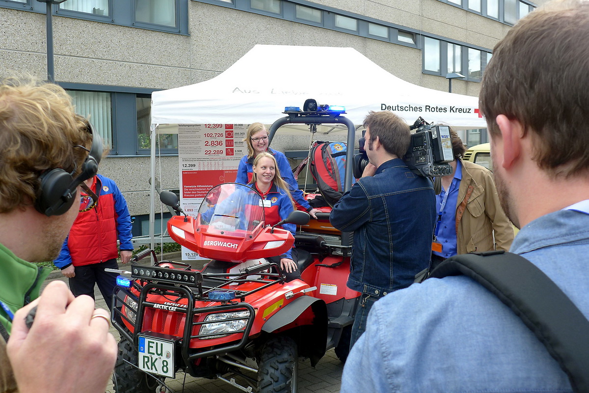 Angela Merkel und Innenminister Thomas de Maizière danken ehrenamtlichen Helfern für Einsatz bei der Flutkatastrophe 2013 – Stellvertretend für Zehntausende war auch die Rotkreuz-Bergwacht aus dem Kreis Euskirchen ins Bundesamt für Katastrophenhilfe eingeladen – Regierungschefin spricht mit Eifeler Helfern und nimmt auf einem geländegängigen Rettungs-Quad Platz, das unter dem Namen „Arctic Cat“ normalerweise im Wintersportgebiet Udenbreth und von Vogelsang aus im Nationalpark Eifel Dienst tut – Bessere Lobby für zwei Millionen Ehrenamtliche, politische Unterstützung für leichtere Freistellung vom Arbeitgeber?
