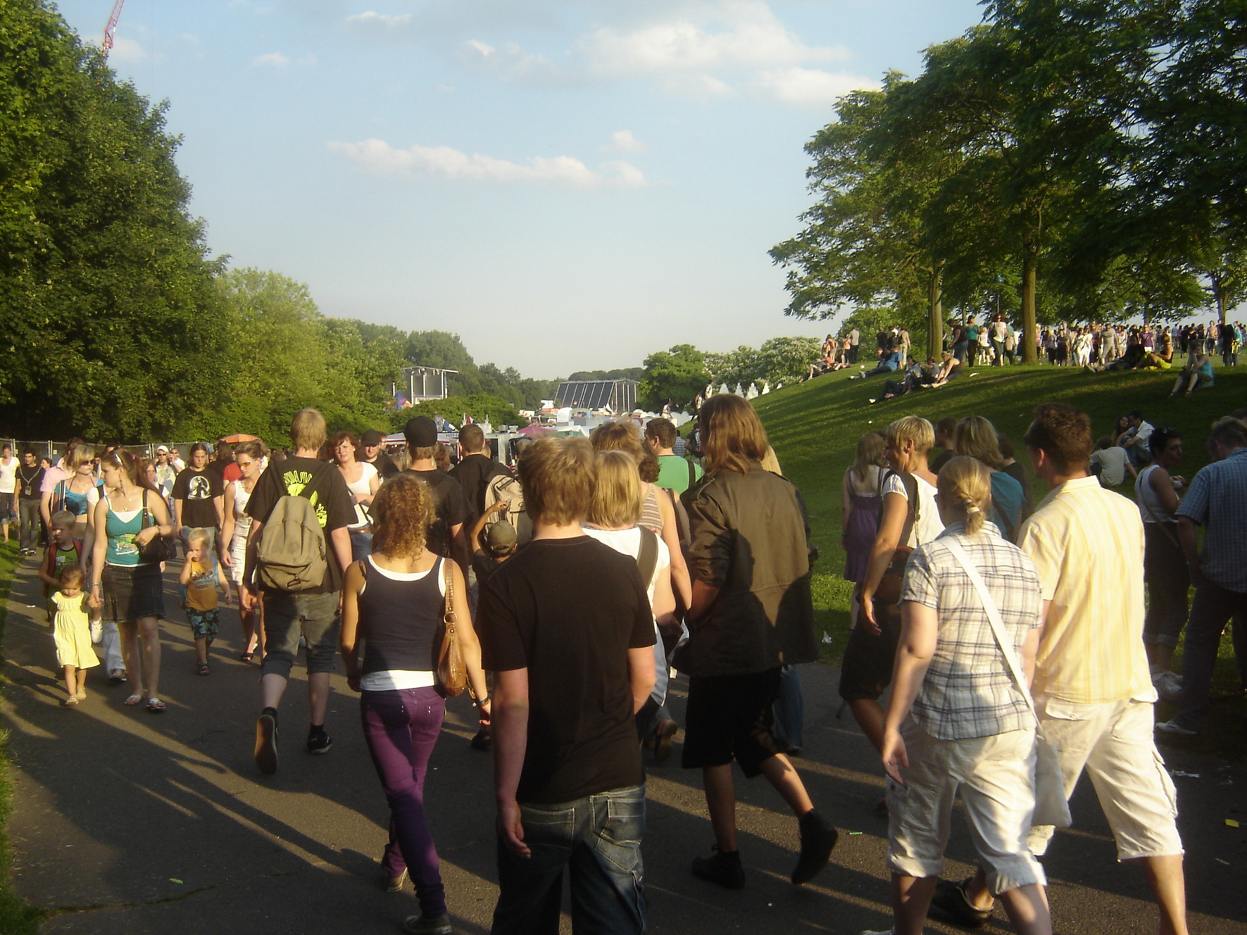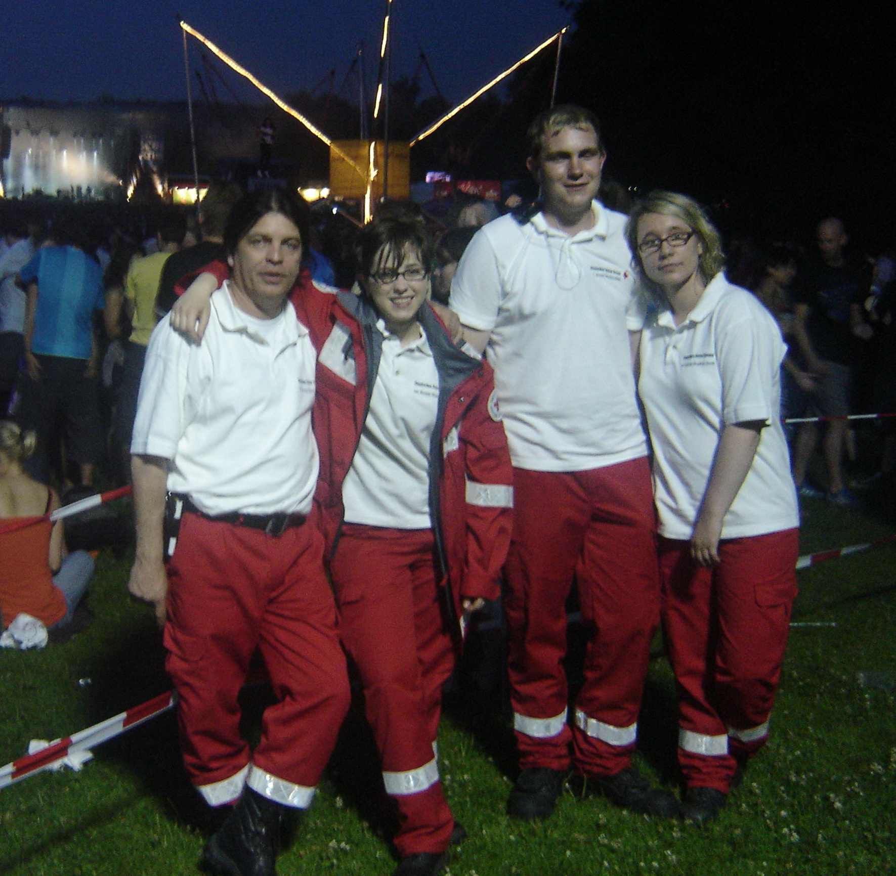 Nach dem Eintreffen in Bonn und der Einweisung in die Lage durch die Einsatzleitung gab es erst einmal ein kräftiges Abendessen. Dabei wurde die Aufteilung der 20 Helfer/innen auf die UHS besprochen, und dann ging es ins Gelände. Wo am Vortag noch leere Wiesen waren, drängten sich bereits am frühen Abend tausende Besucher, um einen günstigen Platz an einer der fünf Bühnen zu bekommen.