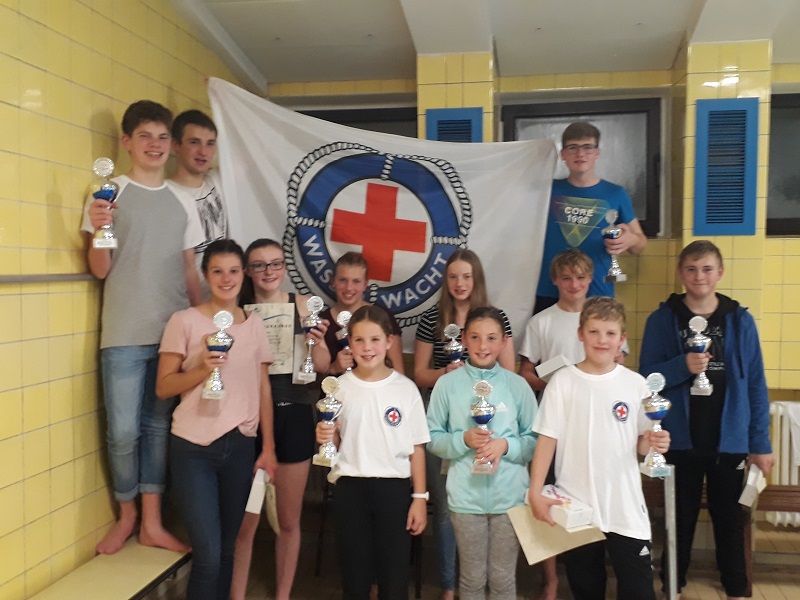 In der bestehenden Form gibt es diesen Wettbewerb bereits seit 1997. Vergangenen Samstag trafen sich wieder 66 Wasserwachtler im Alter von 7-16 Jahren im Lehrschwimmbad der KGS Dahlem um sich schwimmerisch in drei Altersklassen zu messen. Die Stimmung war berauschend, als die Kinder und Jugendlichen jeweils fünf Disziplinen aus den Bereichen Freistil, Lagen, Tauchen, Schleppen, Retten und Kleiderschwimmen bestritten. Je nach Altersklasse sind diese Disziplinen zunächst spielerisch gestaltet, nähern sich jedoch in der AK III immer mehr den Anforderungen der aktiven Wasserretter an.