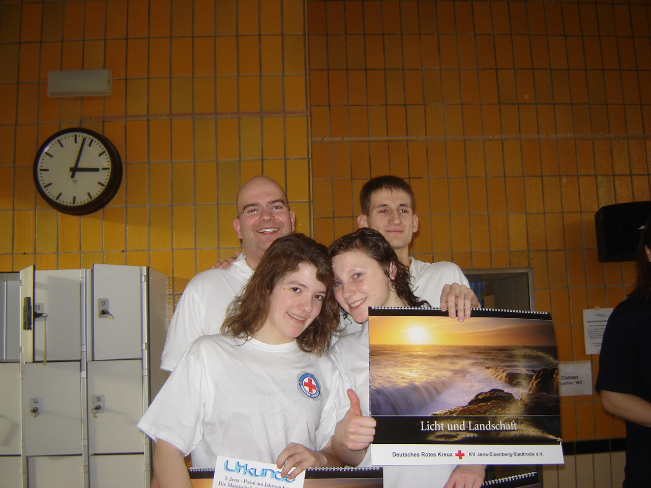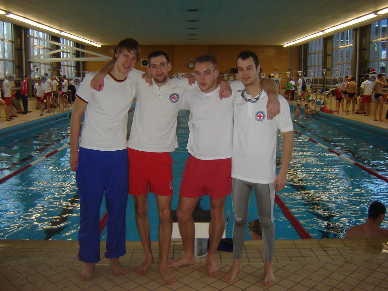 Am nächsten Morgen um 9 Uhr begannen im dortigen Schwimmbad die Wettkämpfe um den vor drei Jahren ins Leben gerufenen Jena-Pokal. Zu den auch in NRW bekannten Rettungsschwimmstaffeln wie Tauchstaffel, Flossenstaffel, Kleiderschwimmstaffel usw. kam dieses Jahr als "Jena-Special" die Knotenstaffel hinzu. In dieser musste man, nachdem man 50 Meter Kraul geschwommen hatte, entweder einen Palstek oder einen Kreuzknoten auf dem Schwimmbadboden an einem Fünf-Kilo-Ring stechen. Was für alle Mannschaften eine große Herausforderung darstellte.