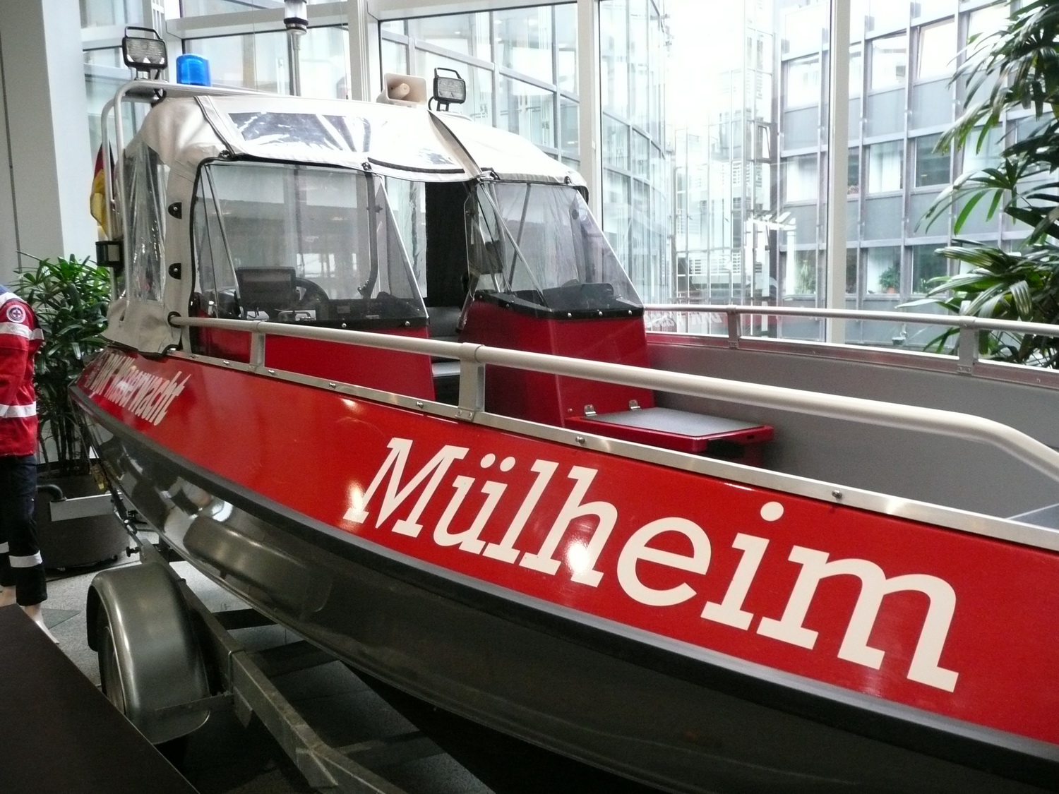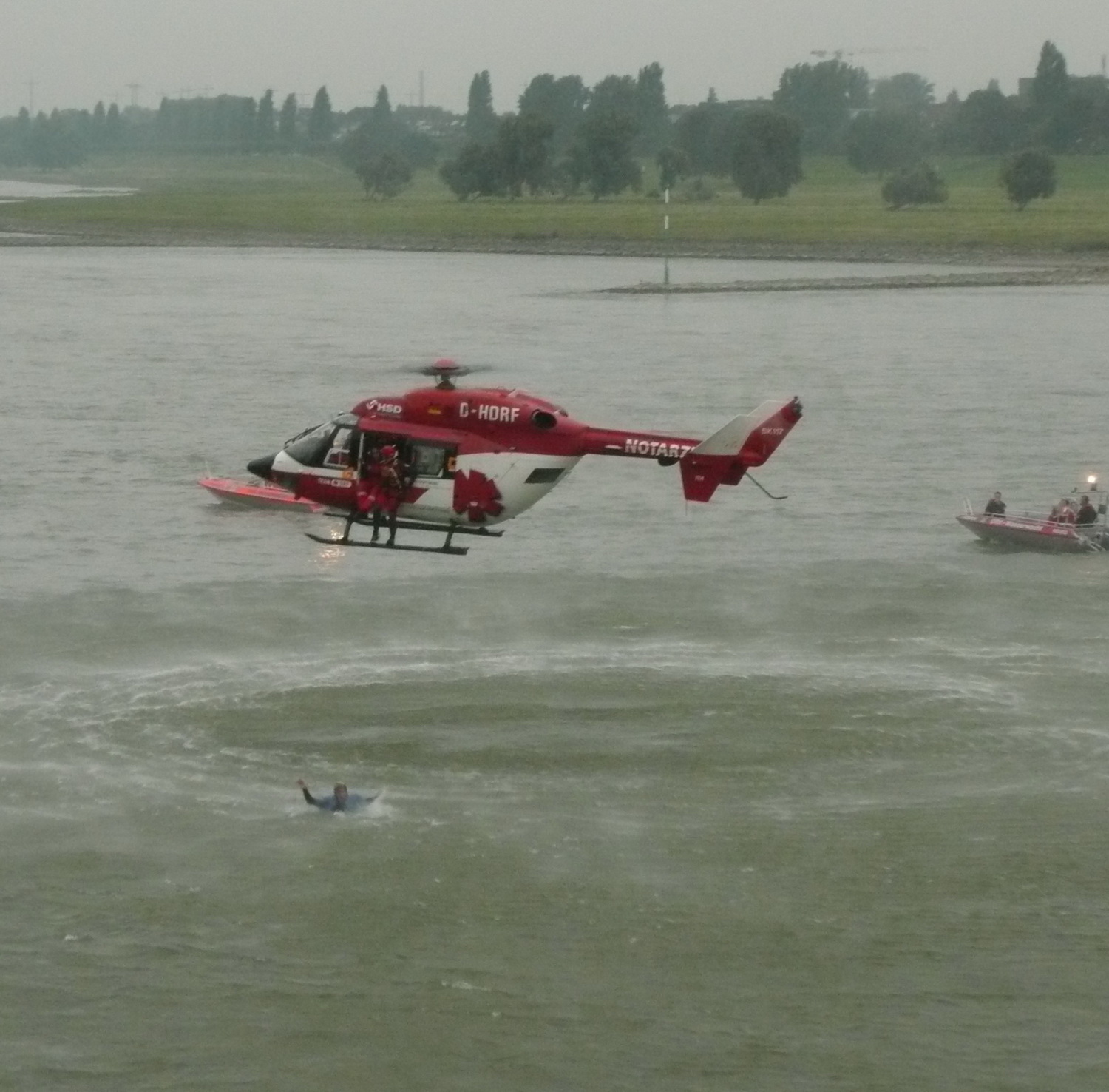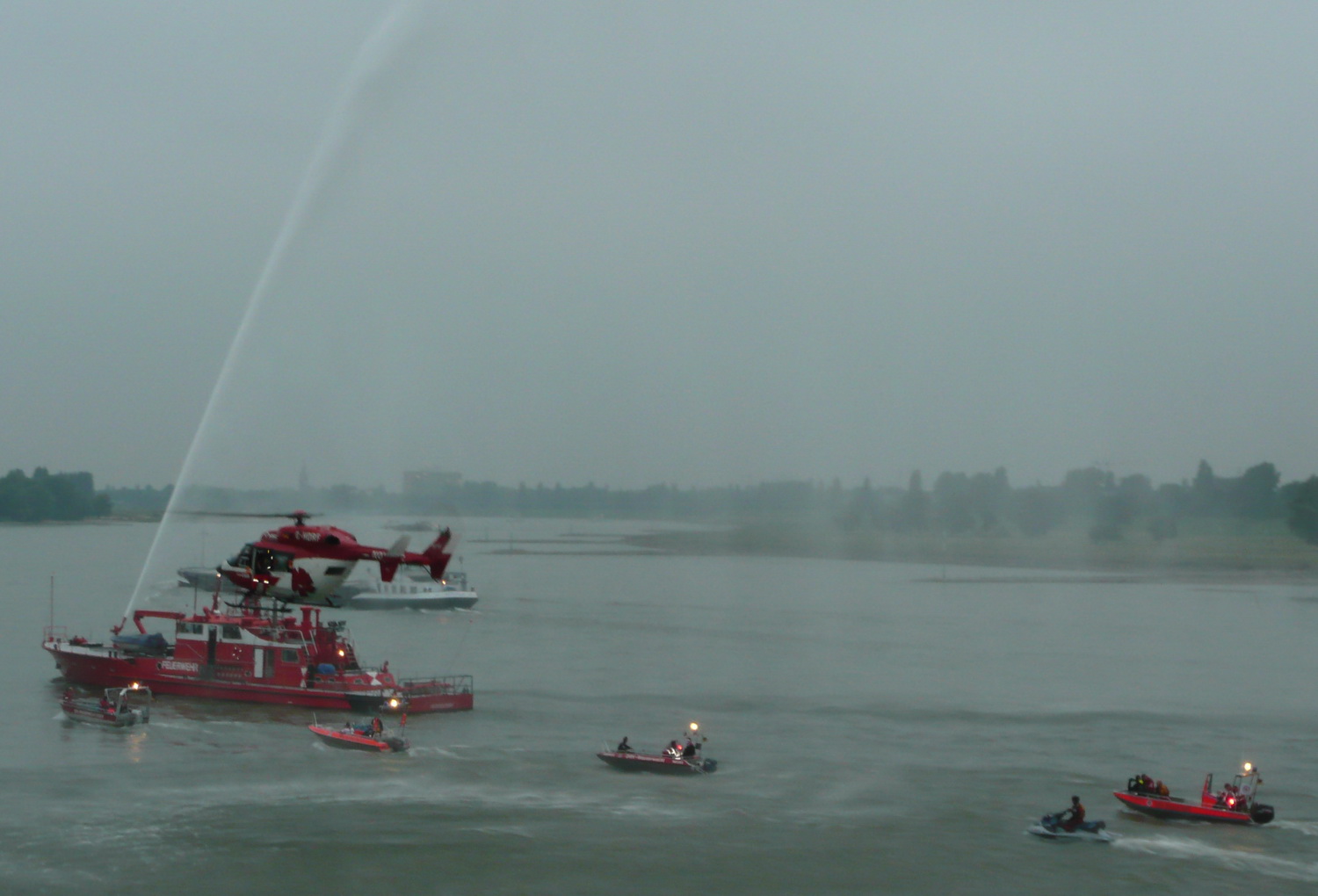 Von der Terrasse des Landtages aus konnten die Gäste die koordinierten Einsätze von Rettungsbooten der Rotkreuz Wasserwacht, einem Löschboot der Feuerwehr und einem Rettungshubschrauber miterleben.