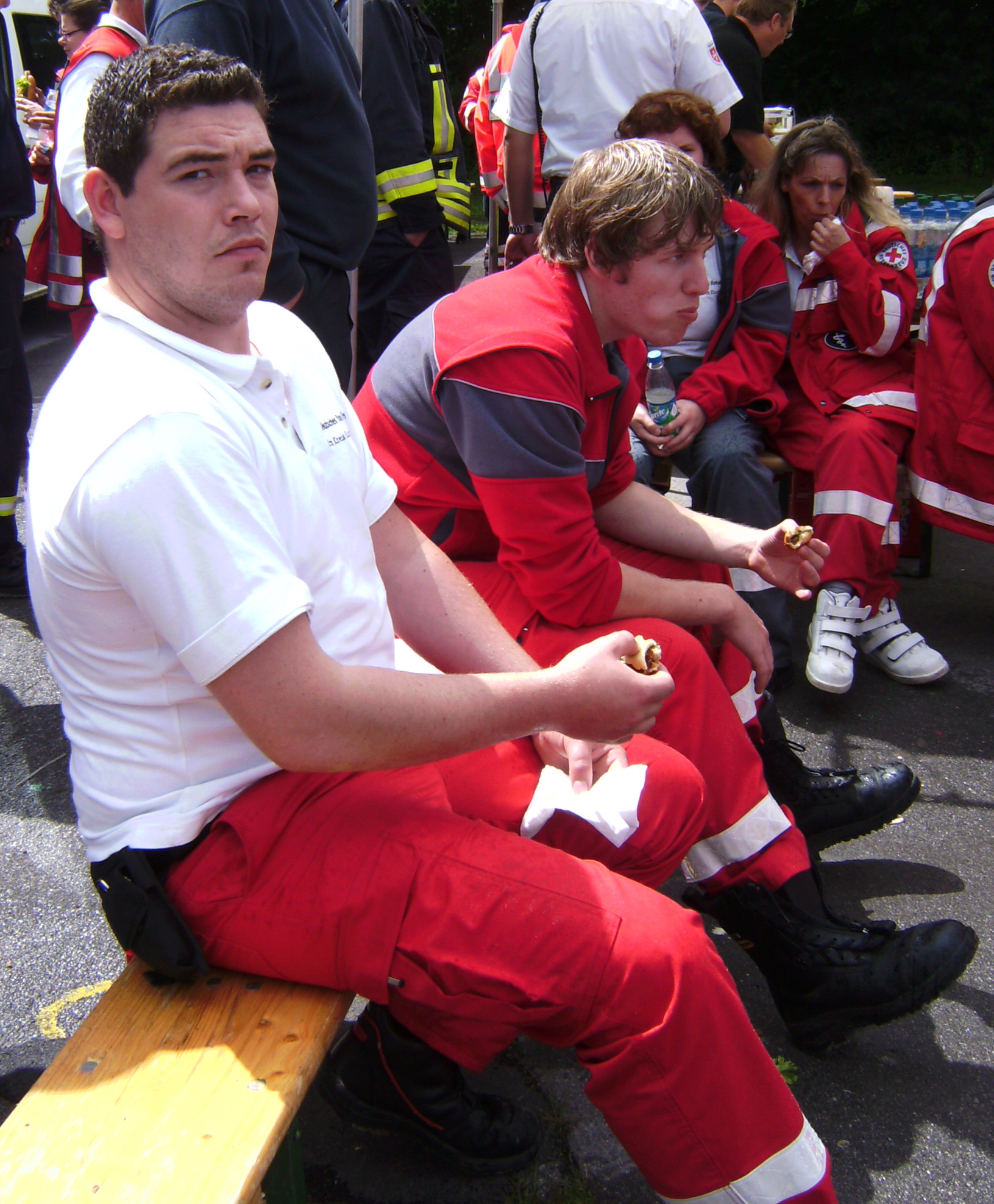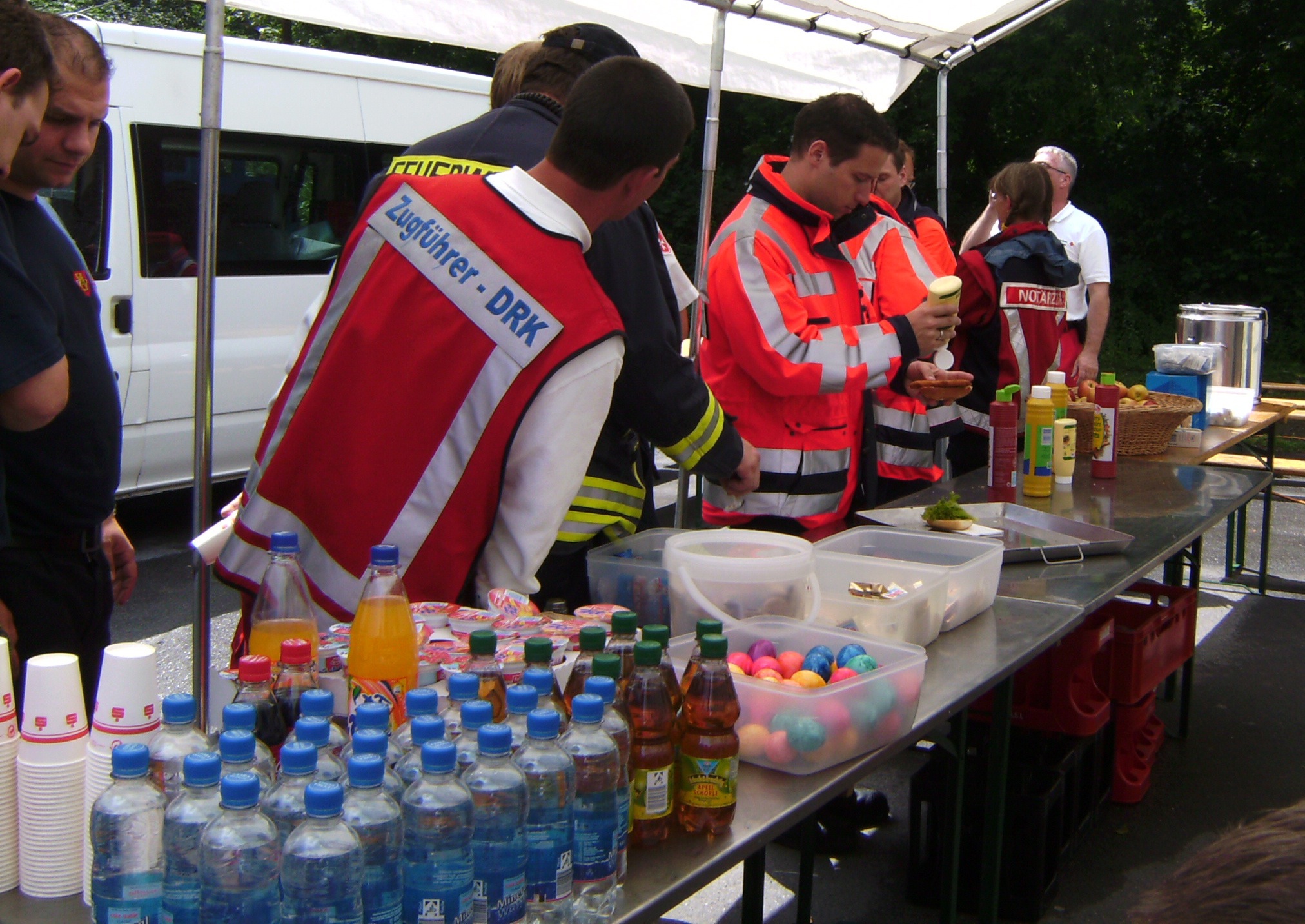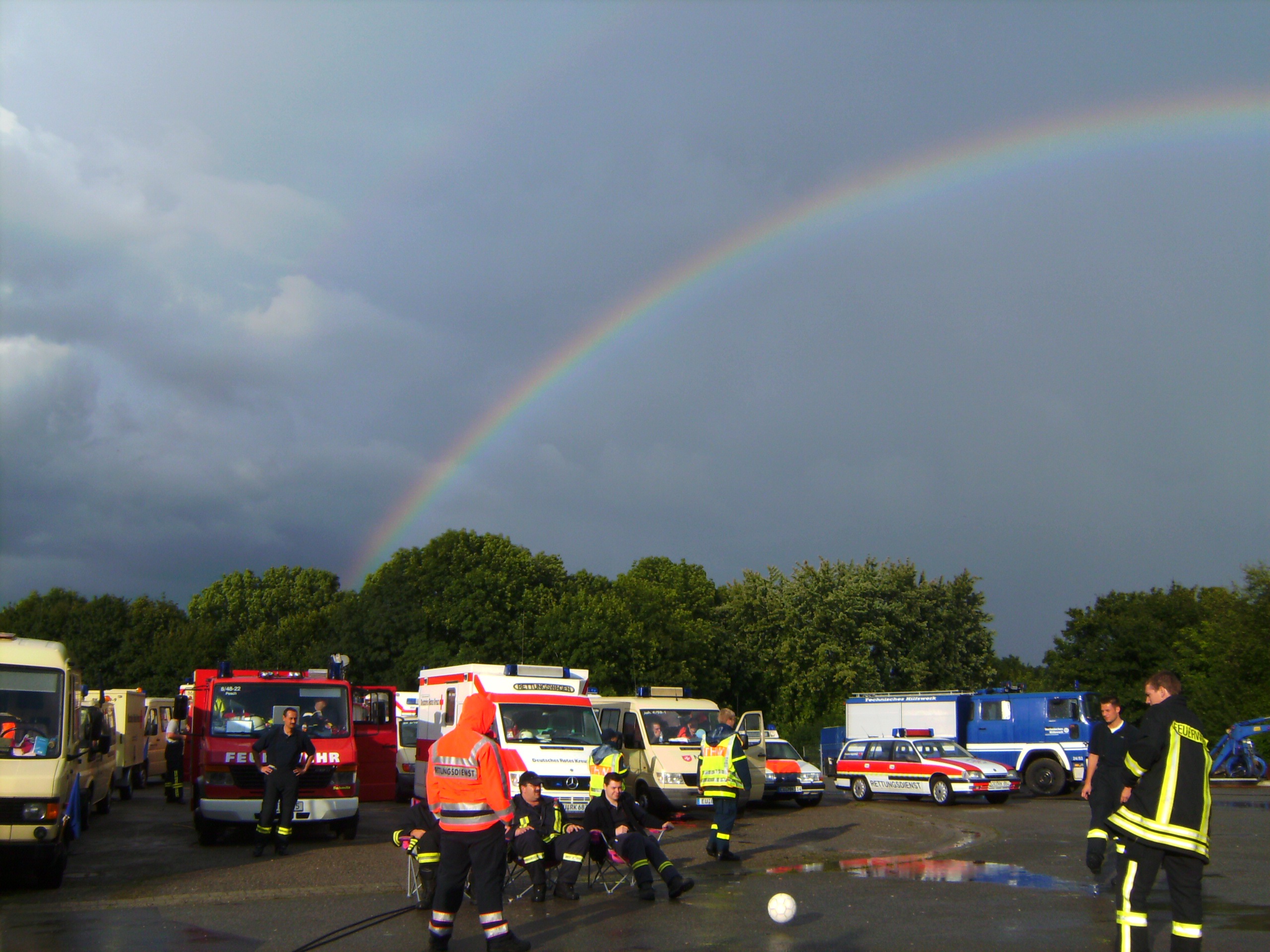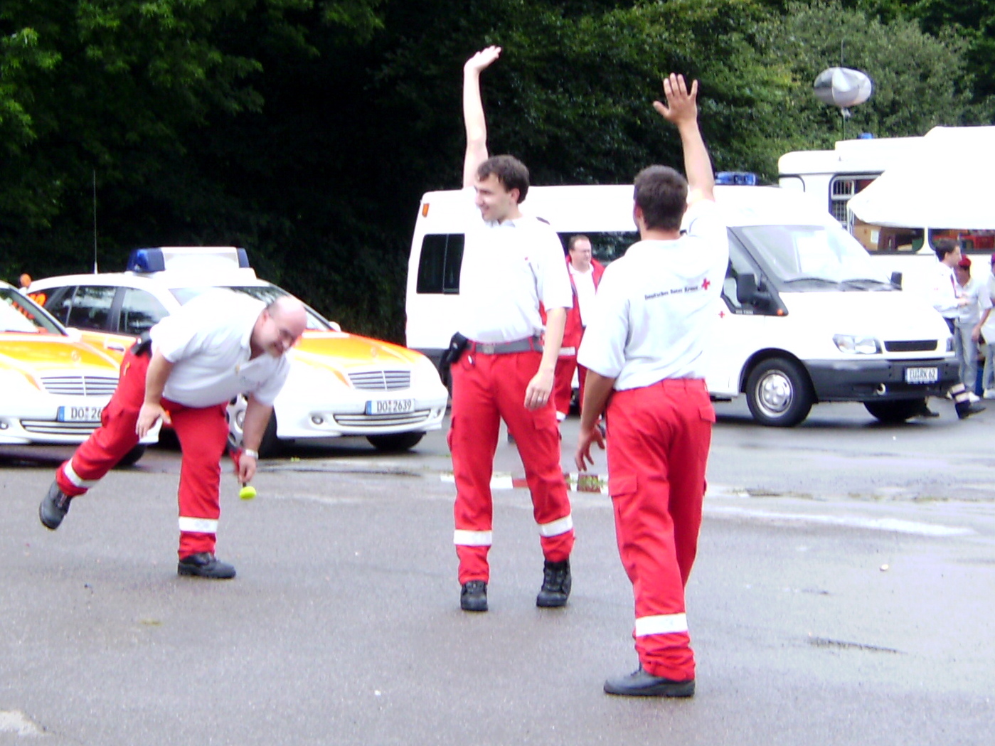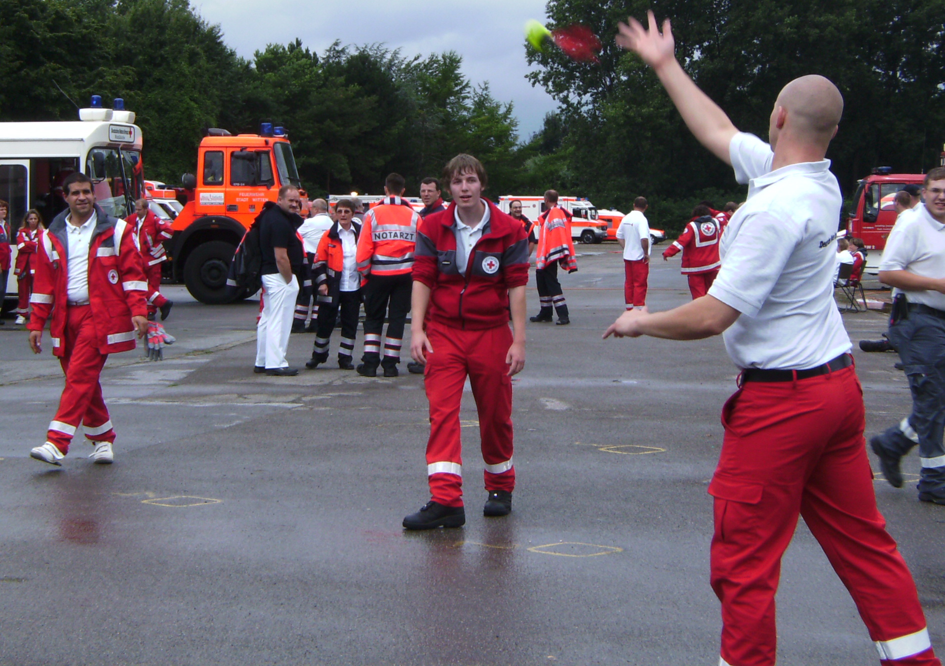 Der zeitweise heftige Regen dämpfte die Laune der Einsatzkräfte nur wenig. Gemeinsam spielten die Helfer "Indiaca", ein Spiel, bei dem ein großer Federball mit gezielten Handschlägen durch die Luft geschlagen wird. Als Abwechslung diente während der Wartezeit auch ein Fußballspiel mit den Kollegen des Kreisrettungsdienstes und ein Frisbee-Spiel mit dem ortsansässigen Technischen Hilfswerks (THW).