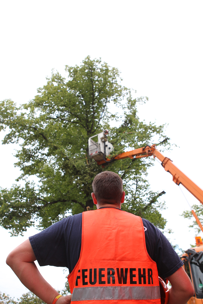 Verpflegt werden die Einsatzkräfte der Feuerwehrbereitschaft Aachen-Heinsberg. Immer wieder rücken die Feuerwehrleute mit Hubsteigern und Drehleitern sowie Schnittschutzbekleidung und Kettenmotorsägen in zugewiesene Bereiche der Stadt, um Straßen und Gehwege von den Sturmschäden zu beseitigen.