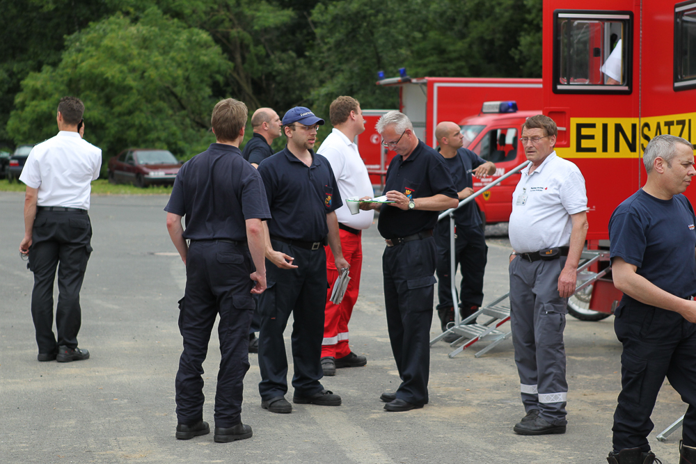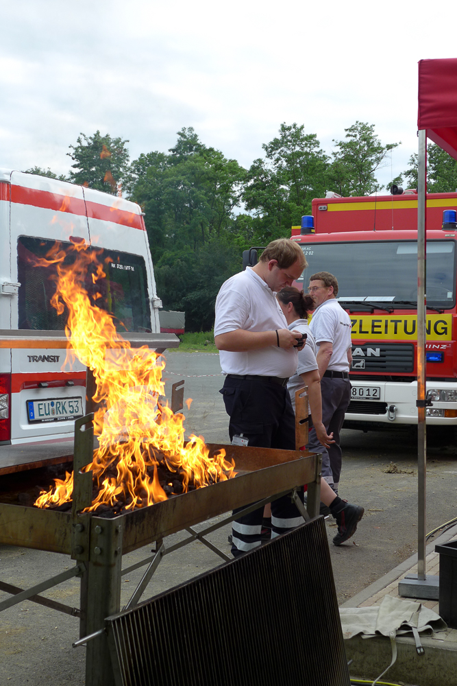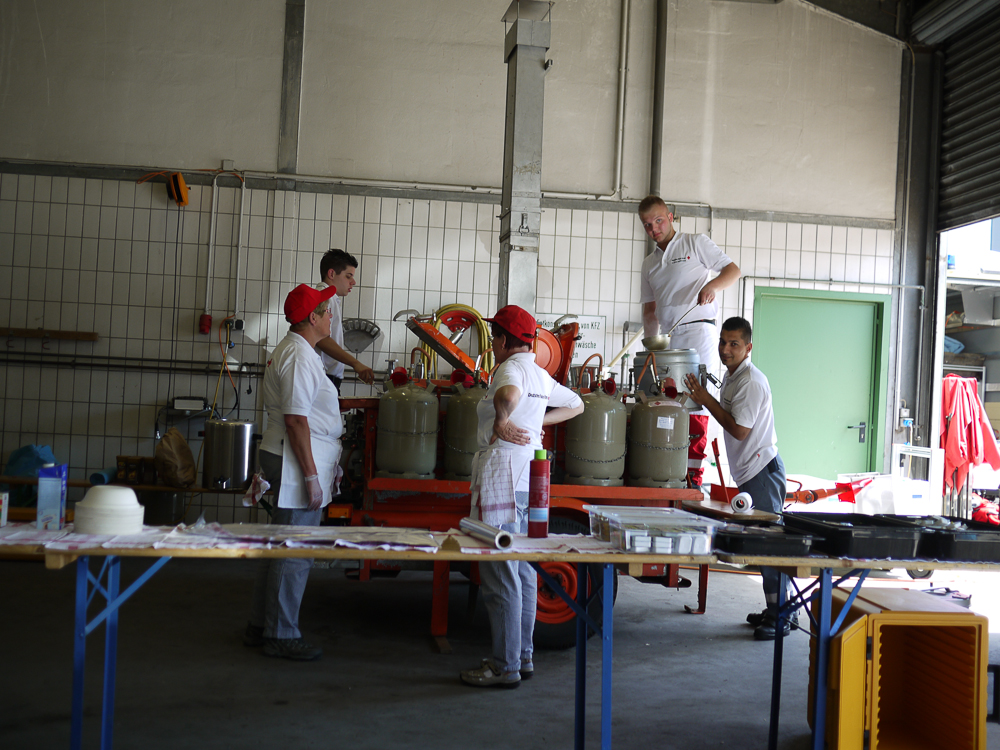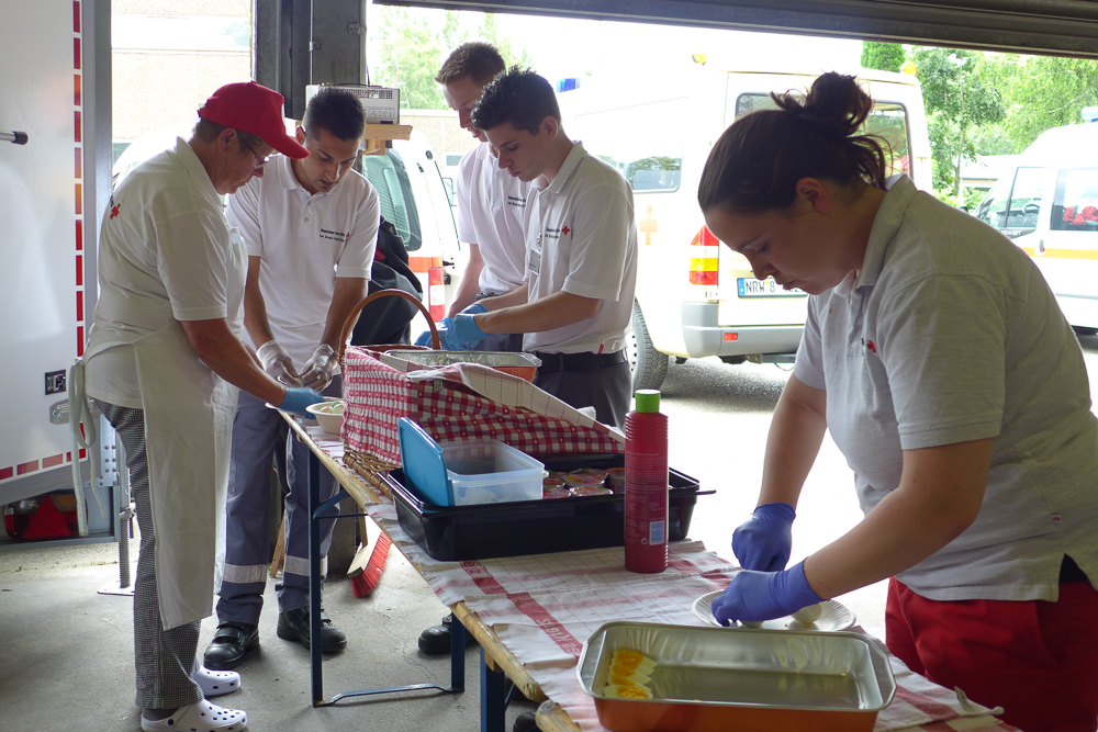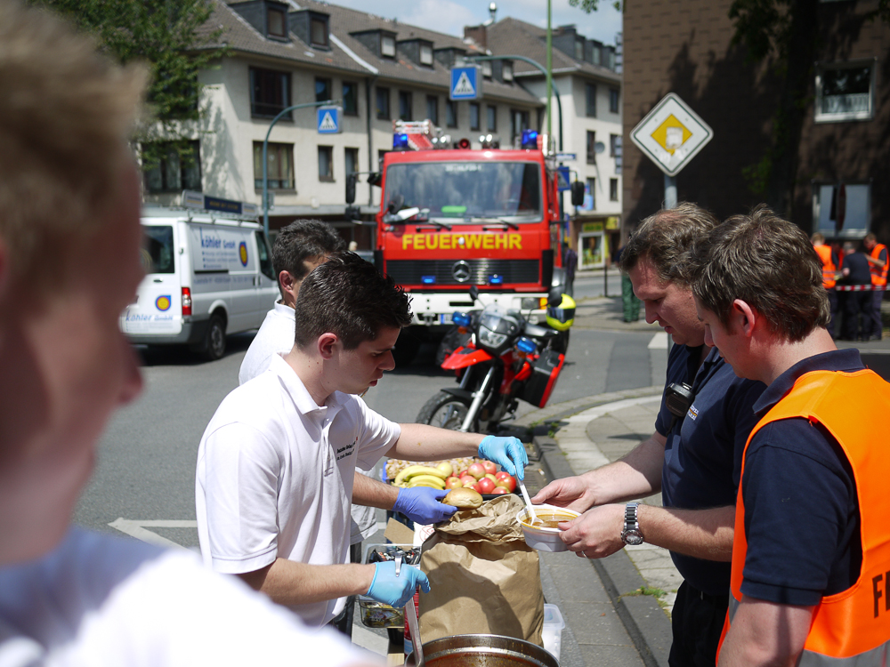 Mittendrin: Das Kreis Euskirchener Rote Kreuz, das mit einer Verpflegungseinheit insgesamt rund 180 Einsatzkräfte versorgt. Auf dem Gelände der Feuerwache 19 in Essen-Borbeck hat eine 16-köpfige Gruppe um Herbert und Angelika Schmitz ihre Verpflegungsstelle aufgebaut.