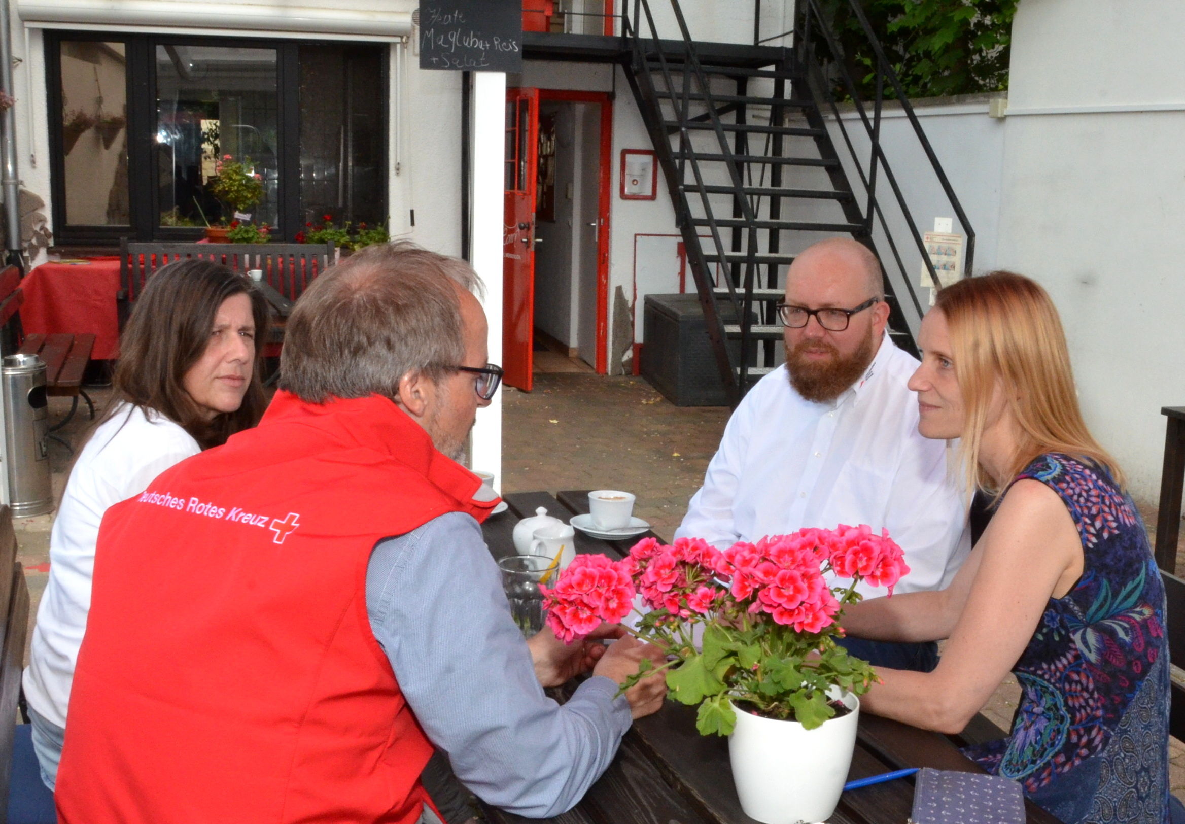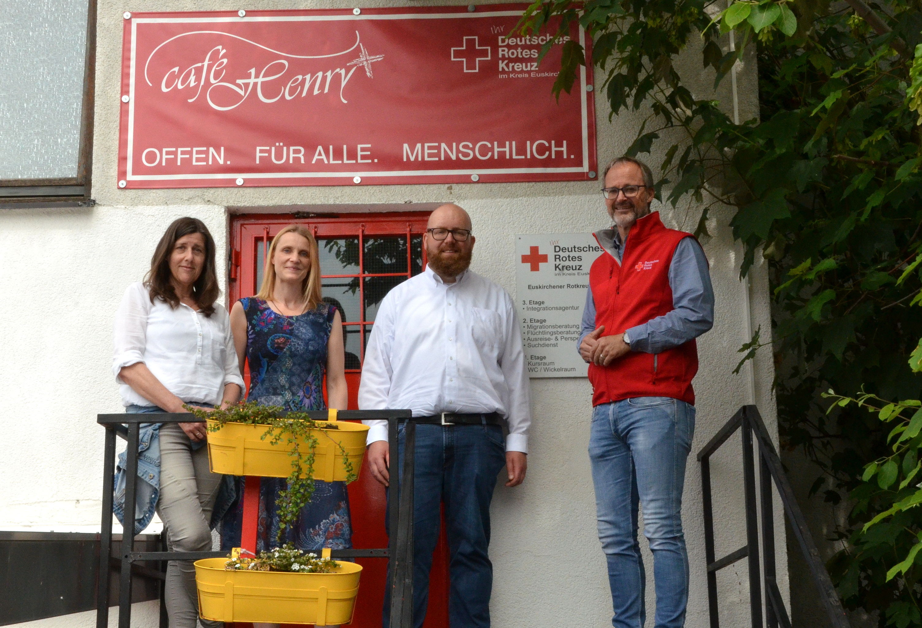 Euskirchen – Der Rotkreuz-Kreisverband Euskirchen wurde kürzlich von der „Neue Wege Reisen GmbH“ mit einer Spende über 4000 Euro unterstützt. Kreisgeschäftsführer Rolf Klöcker, Sabine Heines, Koordinatorin des DRK-Mehrgenerationenhauses und Boris Brandhoff, Leiter des Teams Migration/Integration beim Rotkreuz-Kreisverband Euskirchen, empfingen die Spende dankbar von Christine Göritz bei strahlendem Sonnenschein im Hof des Euskirchener Rotkreuz-Mehrgenerationenhauses.