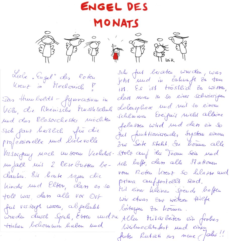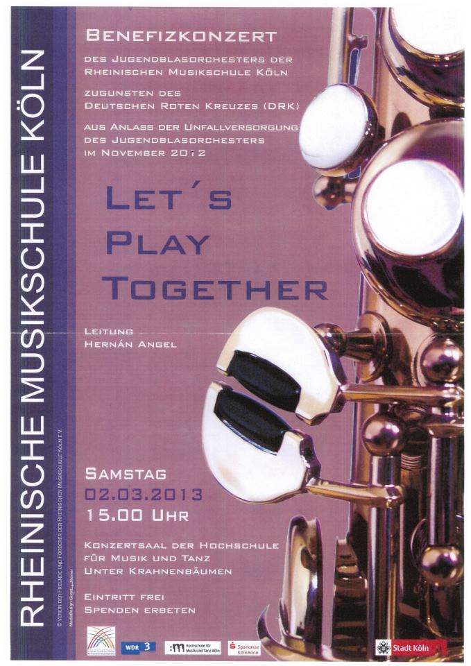 Die Rheinische Musikschule der Stadt Köln möchte ihre Dankbarkeit für die geleistete Hilfe bei der Bewältigung des Geschehens mit einem Benefizkonzert des Jugendblasorchesters zugunsten des Deutschen Roten Kreuzes zum Ausdruck bringen.“