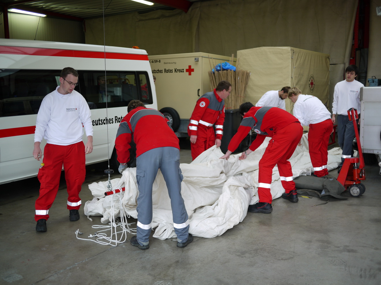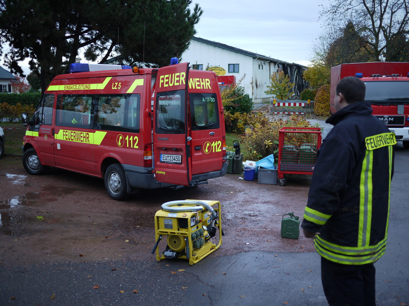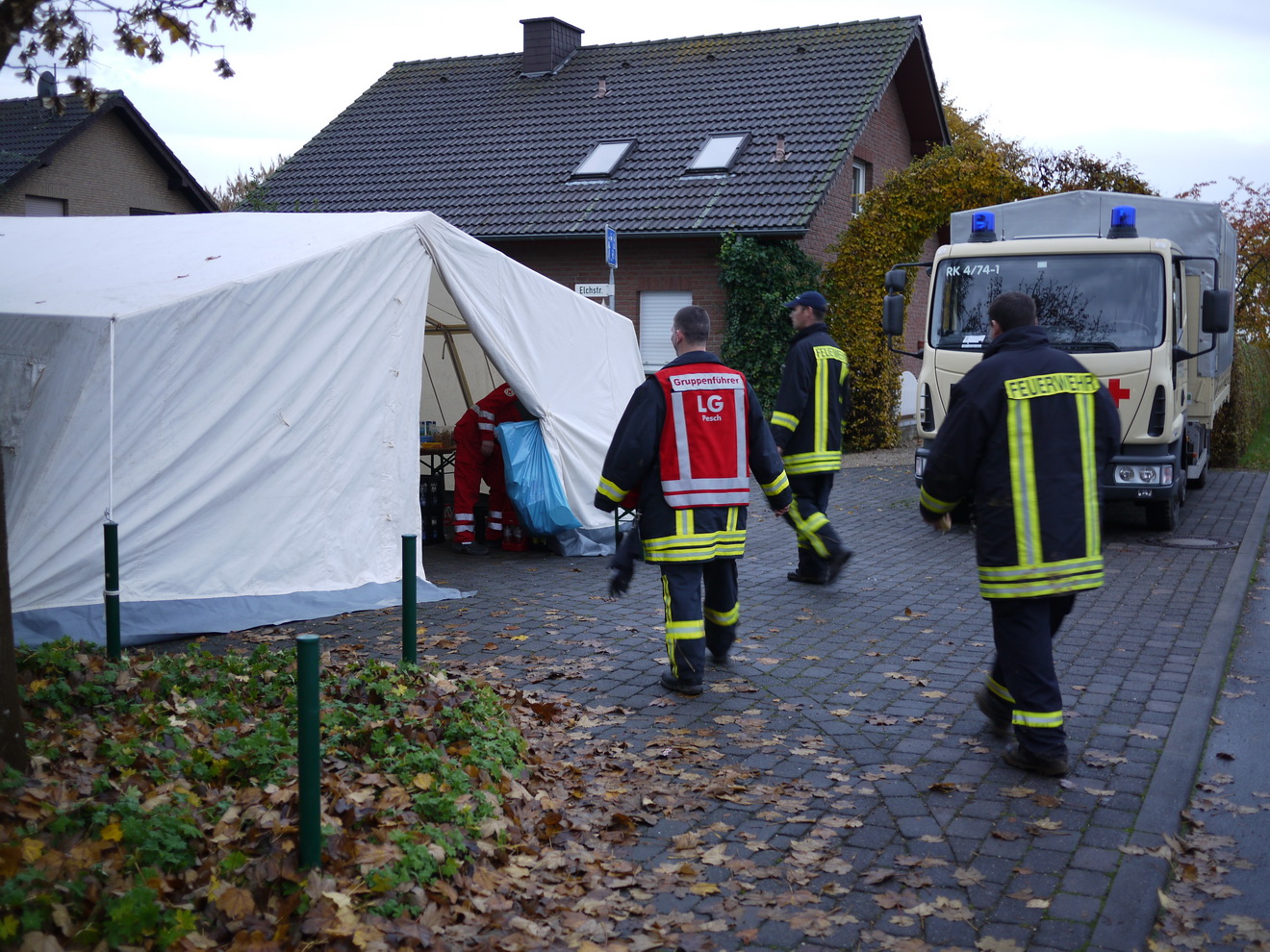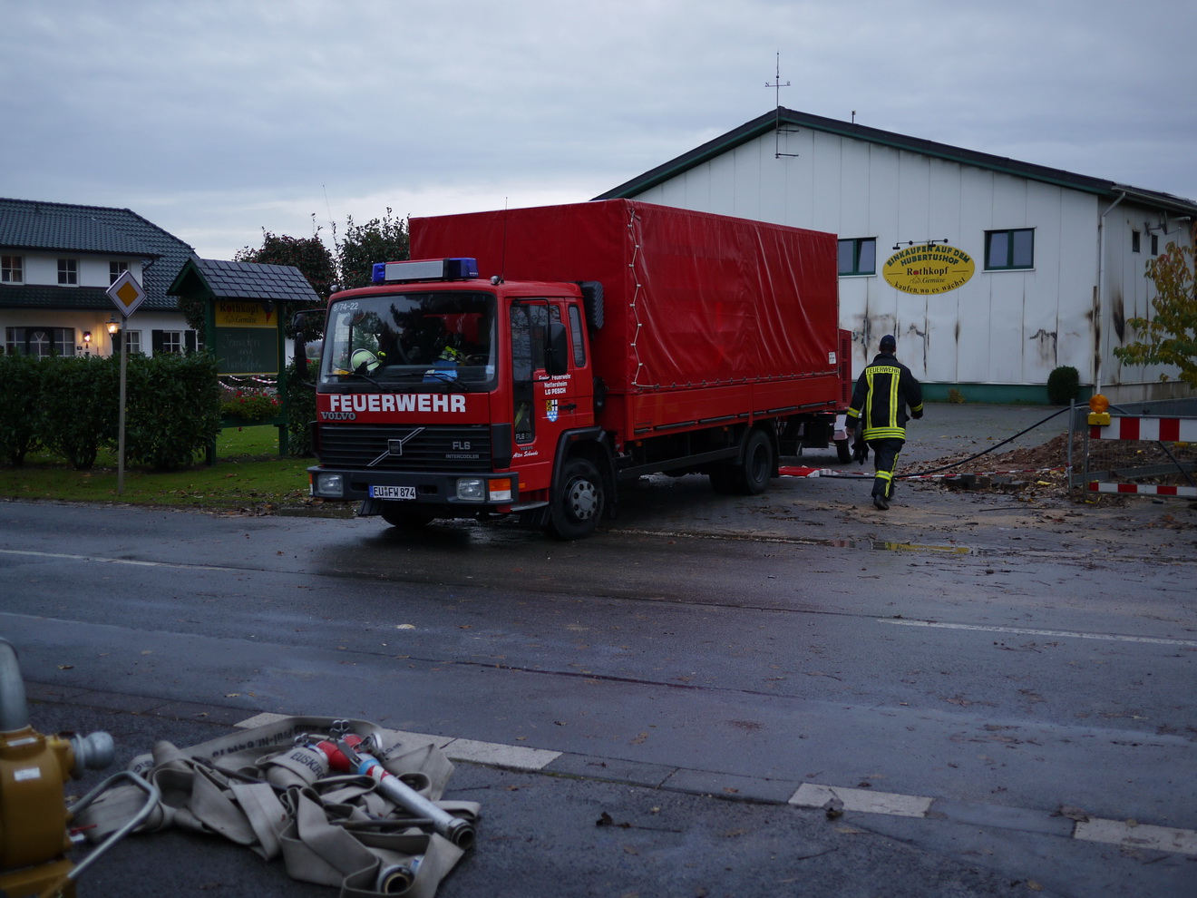 Am Montagmorgen ist es endlich geschafft. Der Großbrand in Dom-Esch gelöscht. Feuerwehr und Rotes Kreuz können die Einsatzstelle aufräumen und das Material wieder in die Unterkünfte bringen. Damit ist die Arbeit aber noch lange nicht beendet. Bei der Feuerwehr müssen Schläuche, Einsatzmaterial und Fahrzeuge gereinigt werden, beim Roten Kreuz wird die Küche geputzt und die Lagerbestände werden für den nächsten Einsatz aufgefüllt. Das nächste Mal kommt bestimmt, aber alle Beteiligten sind sicher froh, wenn sie jetzt erst einmal richtig ausschlafen können . . . .
