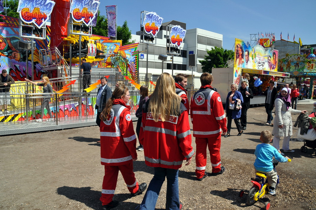 Seit über zwölf Jahren ist auch das Rote Kreuz aus dem Kreis Euskirchen mit dabei. Unweit des Charleviller Platzes haben die Rotkreuzler wieder ihre Ambulanz-Station aufgebaut. In enger Zusammenarbeit mit dem Bezirksdienst der Euskirchener Polizei sind die Rotkreuzler während der Kirmestage für die Besucher da, wenn Hilfe gebraucht wird.