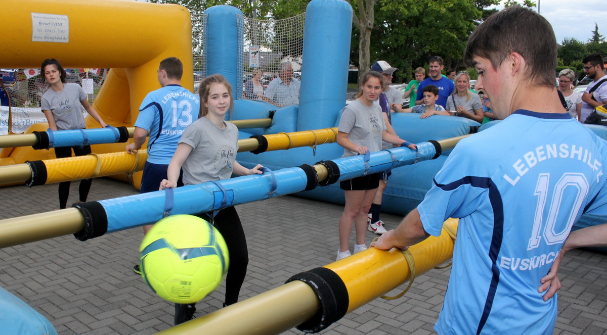 Ständig etwas los war beim Menschenkickerturnier. Selbst als es kurz regnete waren die Teams mit Feuereifer bei der Sache und lieferten sich packende Duelle. Dabei spielte es keine Rolle, ob das Gegenüber an der Stange eine Behinderung hat oder nicht – Kicker war Kicker. Genau so, wie es beim Tag der Begegnung auch sein sollte.
