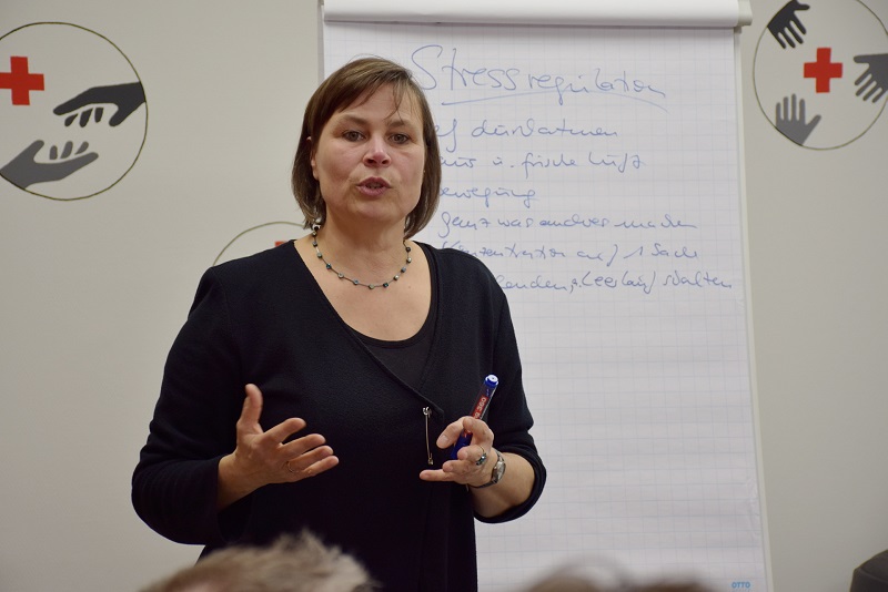 Wie die Ruhe selbst wirkte Erika Sander, die Referentin vom Eichenberg Institut, bei ihrem Vortrag zum Thema „Stress“. „Übung macht den Meister“, gab sie als Credo an die Teilnehmer weiter. Denn nur, wer schon in Ruhe sicher ist, könne die Anti-Stress-Techniken gezielt und konsequent auch in schwierigen Situationen anwenden. Sie zeigte Maßnahmen auf, wie man Kopf und Körper zum Positiven (und die Sichtweise „halbvolles Glas“ statt „halbleerem Glas“) mit der ABC-Regel konditionieren kann. Außerdem übte sie mit den Teilnehmern „ganz bewusstes tief ausatmen“ und in den „Leerlauf schalten“.