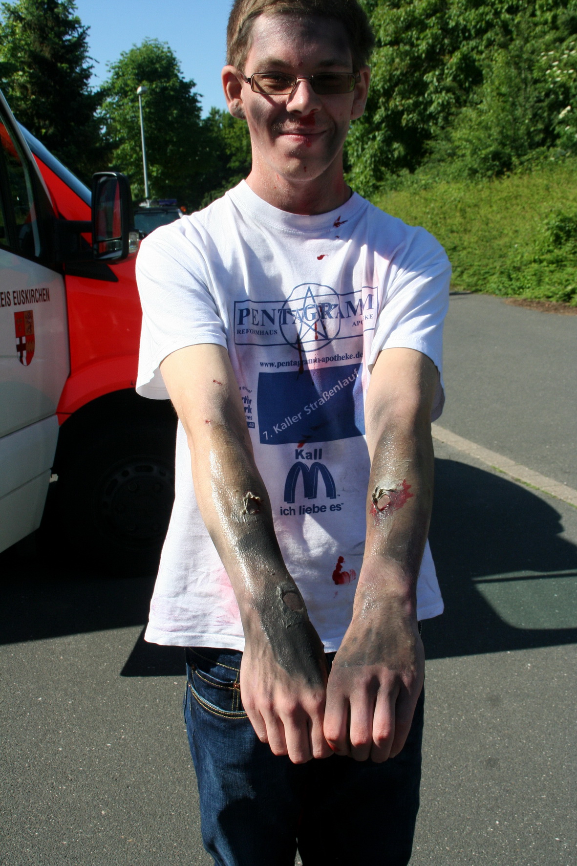 Auch bei dieser Übung des Rettungsdienstes im Kreis Euskirchen wurde wieder einmal klar, wie wichtig eine gute Darstellung der Verletzungen ist. So bekamen die eingesetzten Helfer des Roten Kreuzes, Malteser Hilfsdienst, Technischen Hilfswerks und die Feuerwehrleute ein täuschend echtes Katastrophenbild und eine gute Voraussetzung für ihre Übung.