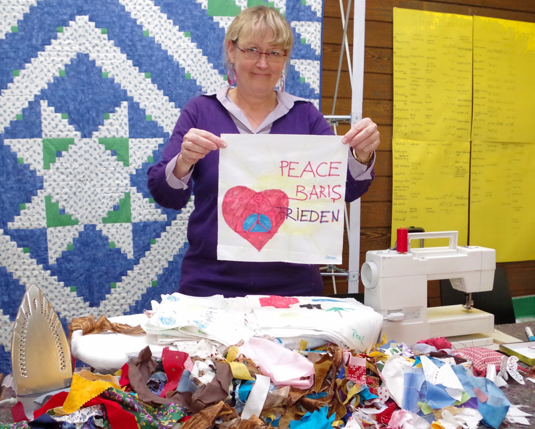 Gemeinsam mit den Besuchern gestaltete der Kaller Künstler Stefan Busch ein Mosaik. Die anfänglich schwarzen und weißen Steine dehnen sich zu einem bunten Durcheinander aus – ganz im Sinne des Friedenstags. Eine weitere Kunstaktion hatte die Künstlerin Carla Brandholt-Witschonke mitgebracht. „Stoff-Marathon für den Frieden“ lautet der Titel der Aktion. Sie forderte die Besucher dazu auf, auf Stoffquadraten ihre persönlichen Friedensbotschaften zu hinterlassen – ob gemalt, geschrieben, gedruckt oder in Patchwork-Technik. 220 Quadrate hat sie bereits zusammen, beim Friedenstag kamen 120 hinzu. „Wichtig ist mir, dass sich jeder dabei Gedanken über den Frieden macht“, erklärt sie ihre Intention.
