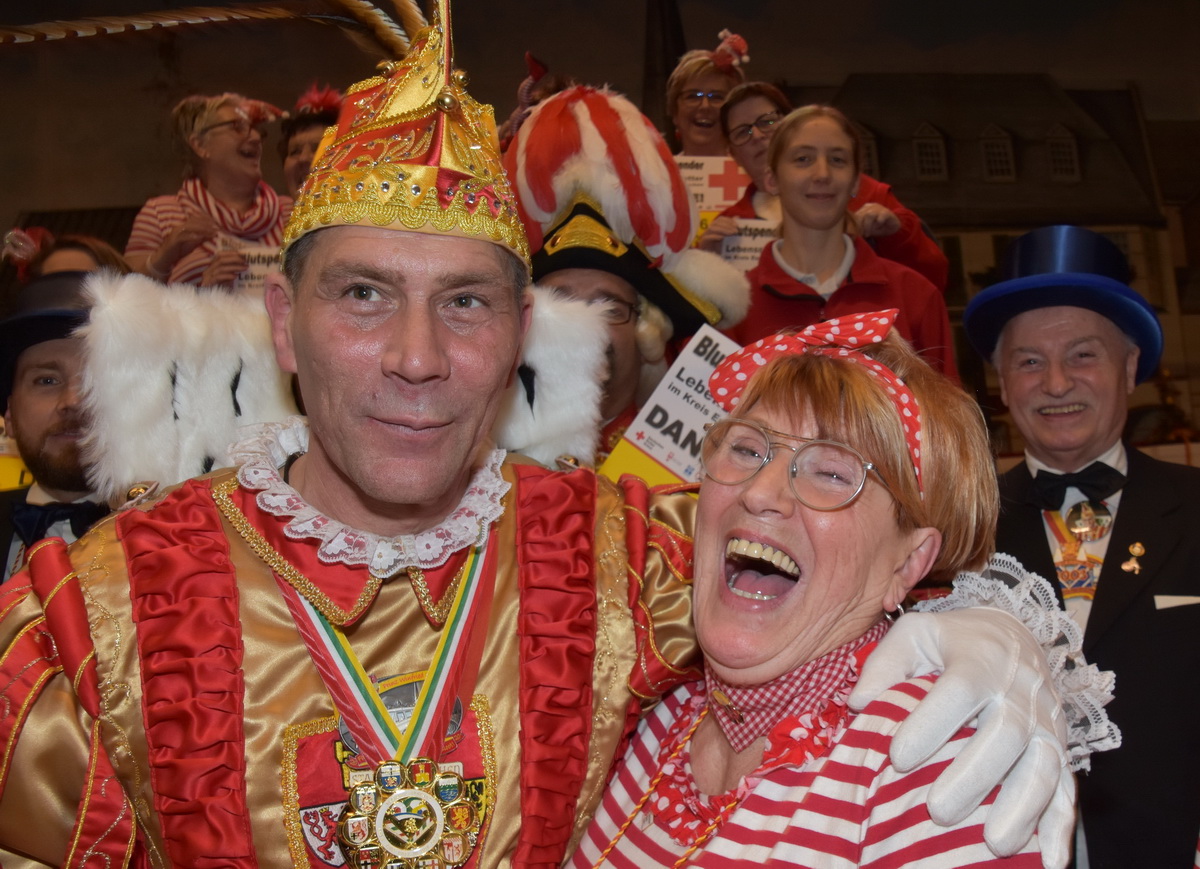Edeltraud Engelen, die stellvertretende Kreisvorsitzende und Blutspende-Beauftragte des Roten Kreuzes im Kreis Euskirchen, bedankte sich nach der Senioren-Sitzung im City-Forum mit einem Bützchen beim Prinzen für sein entschiedenes Plädoyer für die Blutspende: „Irgendwann mal im Leben sind wir selbst auf eine Blutspende angewiesen!“