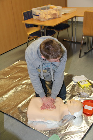 Nach dieser Erholung, die jeden knurrenden Magen zum erzdummen brachte, ging es ran an die Arbeit: Erste Hilfe! Nachdem jeder eine spannende Geschichte zu diesem Thema zum Guten gegeben hatte, frischten wir unser Wissen nochmal auf. Wie setzt man einen Notruf ab? Wie kann man schon ohne jedes Vorwissen helfen? Wir lernten aber auch die stabile Seitenlage und den Umgang mit dem AED.