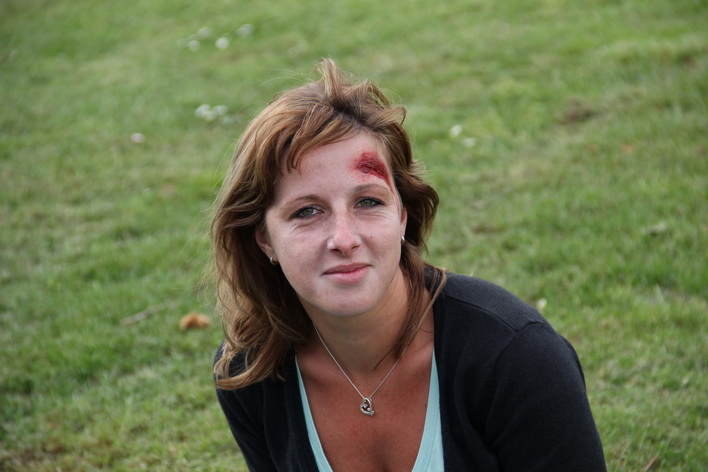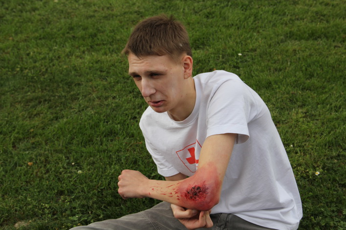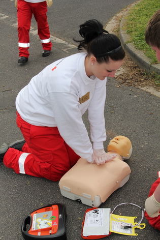 Als Highlight hatte sich Daniel einen kleinen Übungseinsatz für uns ausgedacht und auch organisiert. Es war wie bei einem echten Einsatz mit Funk, Blaulicht, Martinshorn und sogar Verwundeten, die sich bereit gestellt hatten und geschminkt wurden. Wir waren an der Reihe zu retten. Natürlich durfte da die Übungspuppe „Little Anne“ nicht fehlen, an der wir unser erlerntes Wissen mit dem AED anwenden konnten.
