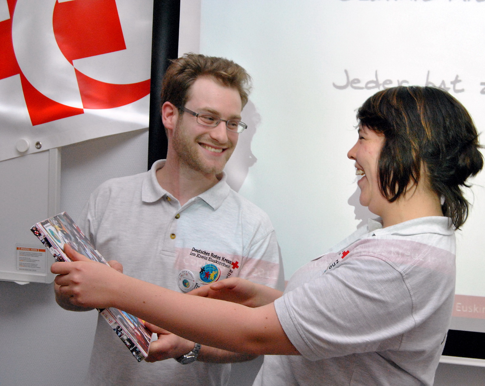 Auf zwei Neuerungen machte Simon Jägersküpper die versammelte Rotkreuz-Jugend aufmerksam: Zum einen wird es ab Mitte des Jahres rote Kapuzenjacken oder –pullis als farbliche Ergänzung zu den hellgrauen Polohemden mit dem Jugendrotkreuz-Aufdruck geben. Zum anderen stellte er den neuen Mitgliedsausweis für die Jugendrotkreuzler vor.
