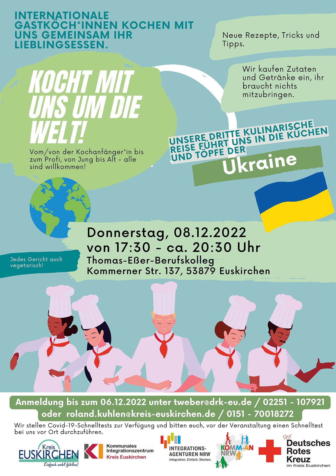Die dritte kulinarische Reise der Reihe führt in die Küchen und Töpfe der Ukraine – Kochprojekt des „Kommunalen Integrationszentrums des Kreises Euskirchen“ und der „Integrationsagentur des Rotkreuz-Kreisverbandes Euskirchen“ am 8. Dezember in Euskirchen