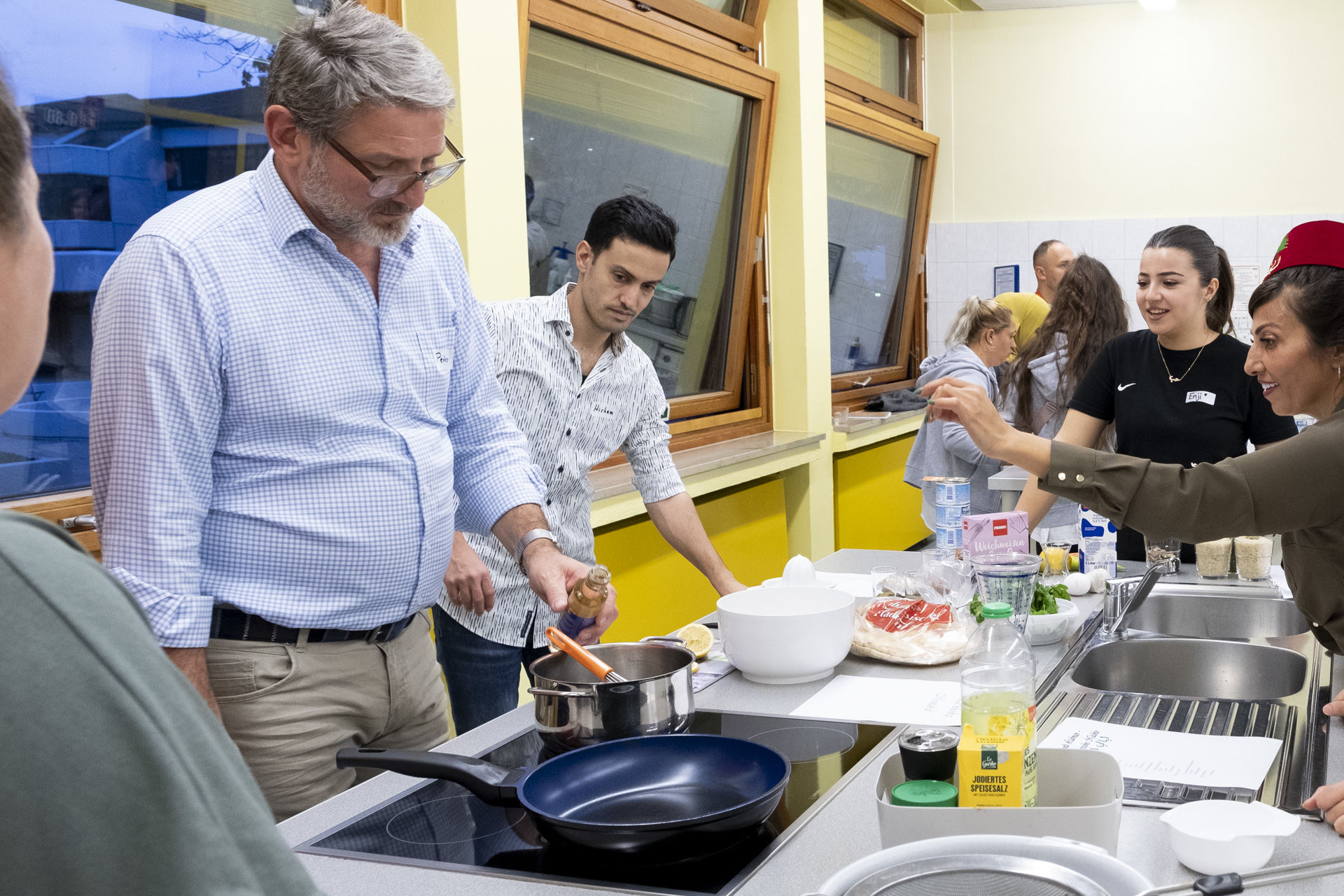 Teilnehmer aus acht Nationen kochten gemeinsam im Thomas-Eßer-Berufskolleg ein leckeres Drei-Gang-Menü – Baba Ghanoush, Bagla und Libanesische Nächte – „Kocht mit uns um die Welt“ heißt die gemeinsame Veranstaltungsreihe von DRK und Kreis Euskirchen