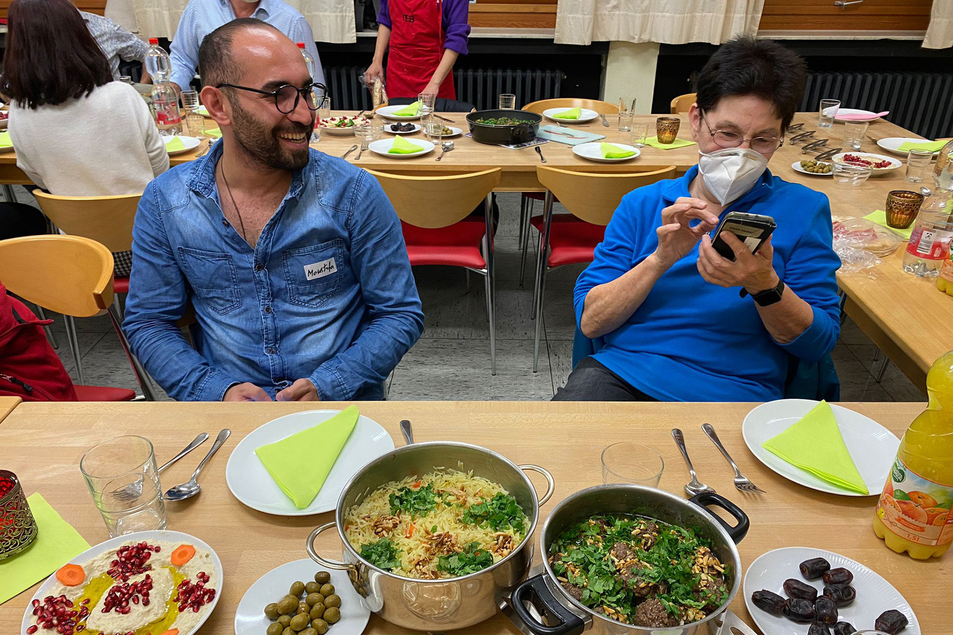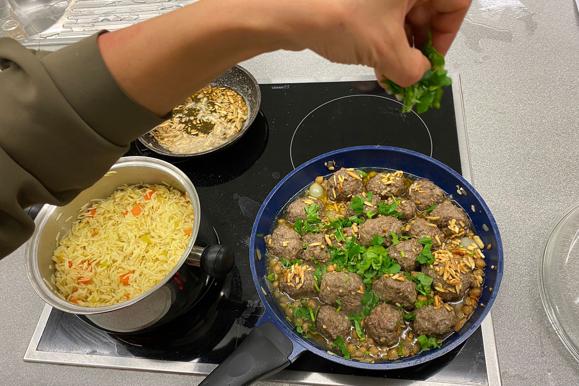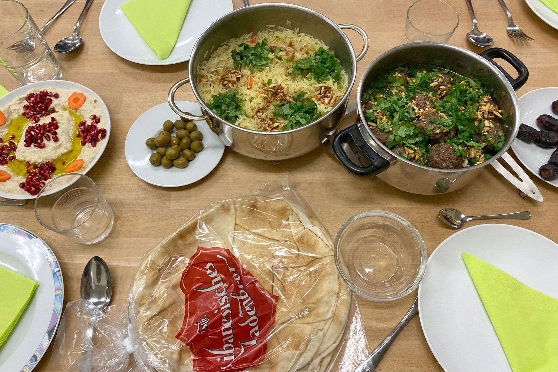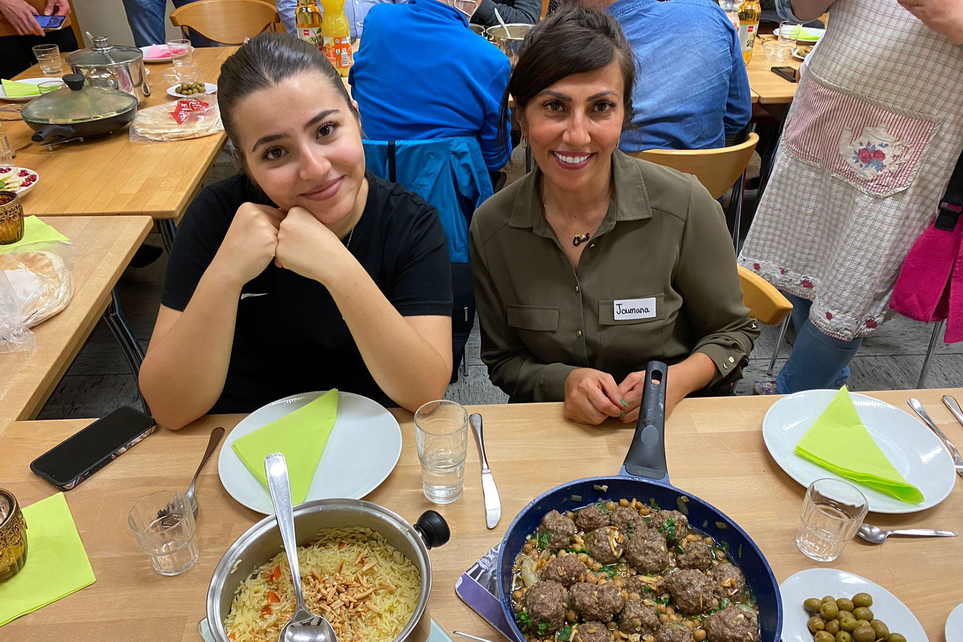 So gab es zum Baba Ghanoush, einem Auberginenpüree mit Sesampaste und Granatapfel, arabisches Brot. Als Hauptgericht wurde Bagla gekocht. Das sind Rinderhackbällchen mit Zwiebeln, Mandeln, Zimt in einer Gewürzsauce mit Kichererbsen und Koriander. Als Beilage hatten Joumana El-Khodr und ihre Tochter Enji Msatat ein Safran-Gemüse-Reis auf die Karte geschrieben.