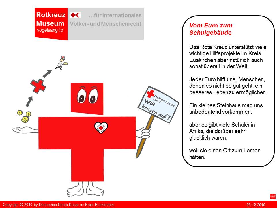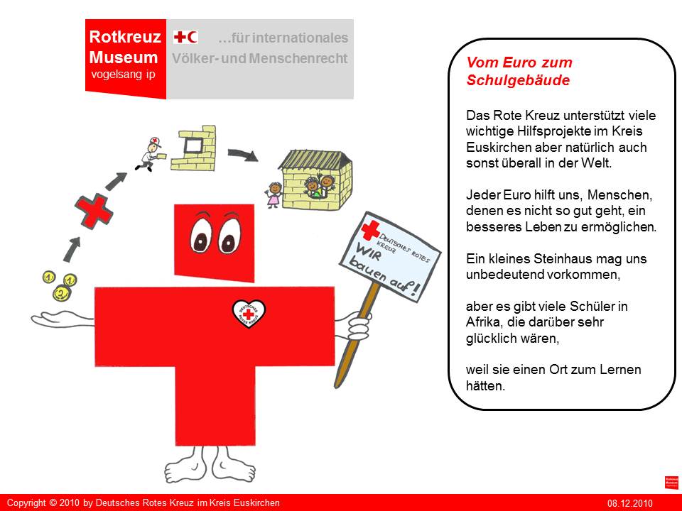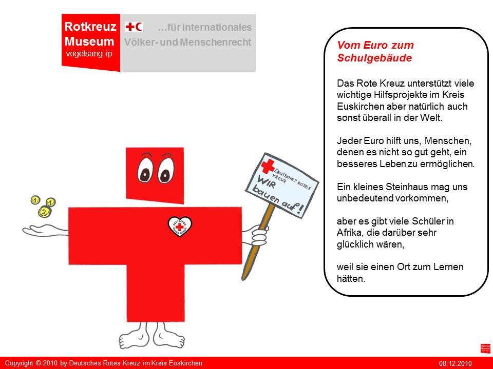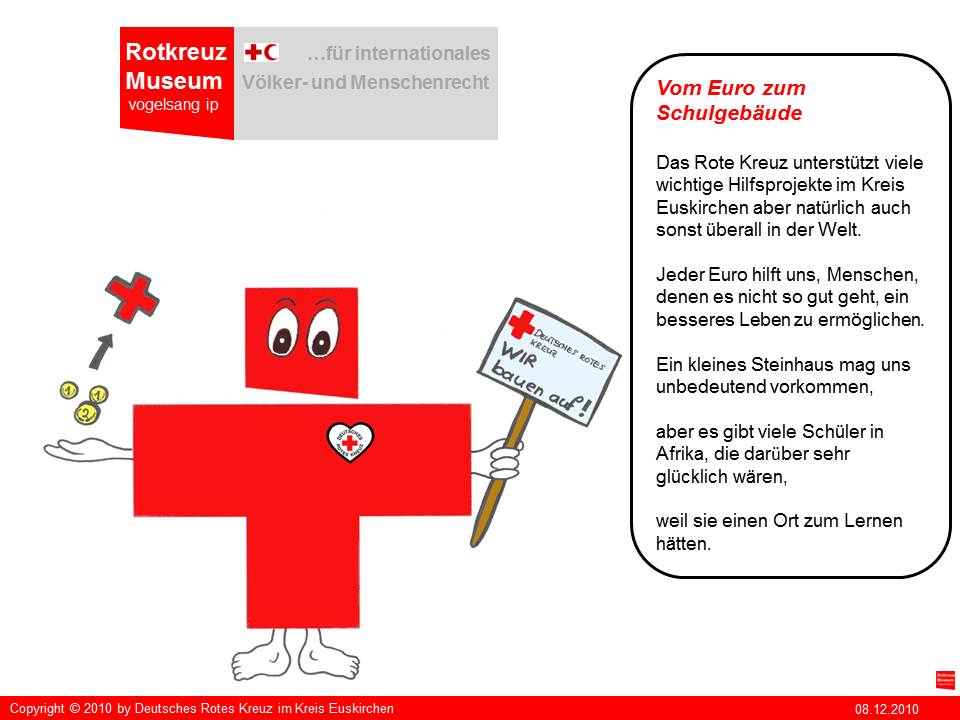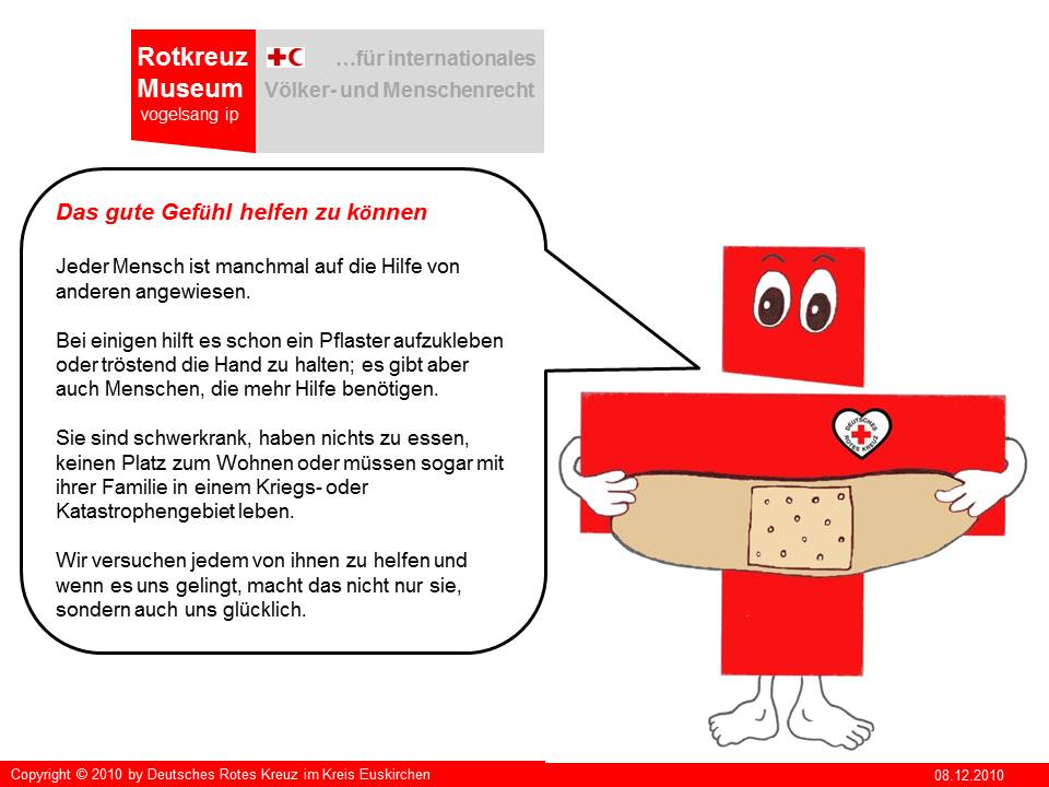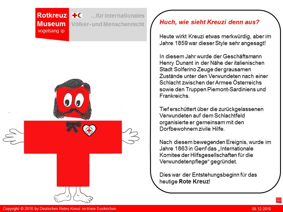 "Kreuzi" ist die kreative Produktion von Irina Müller aus Satzvey die beim Roten Kreuz in Euskirchen ein freiwilliges soziales Jahr leistet. "Kreuzi" soll in der Zukunft Sympathieträger für das geplante Rotkreuz-Museum auf vogelsang ip werden. Seinen ersten Einsatz wird "Kreuzi" aber bei der neuen Aktion "helfen macht Schule!" des Roten Kreuzes im Kreis Euskirchen haben.