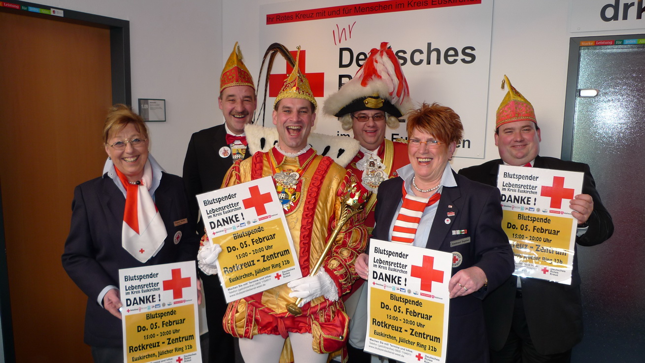 Am 5. Februar kommt wieder hoher karnevalistischer Besuch ins Rotkreuz - Zentrum Kreis Euskirchen/Eifel. Traditionell lassen sich dann ab 15.30 Uhr die Vertreter der Euskirchener Karnevalsgesellschaften, allen voran der jeweilige Prinz Karneval, je einen halben Liter Lebenssaft abzapfen, um damit zu signalisieren: "Oeskerchene Jecke könne nett nur fiere unn lamentiere, se probiere och, jede Wette, dörch Blotspende Lövve ze rette!" In diesem Jahr führt kein geringerer als Kreisstadt-Prinz Otto I. die hoffentlich lange Schlange der Blutspende willigen Närrinnen und Narren ins Rotkreuz-Zentrum an. Auch die Gesellschaften und Prinzregenten von den Außenorten wollen mitmachen!