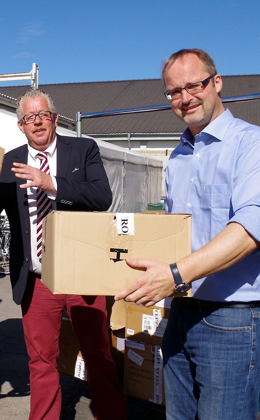 Tausend hochwertige Stücke aus der Vorjahres-Kollektion dem Roten Kreuz im Kreis Euskirchen für Bedürftige zur Verfügung gestellt – Karl-Dieter Schilles bei Übergabe der Ware an Rotkreuz-Kreisgeschäftsführer Rolf Klöcker: „Wollen Hilfe vor Ort leisten“