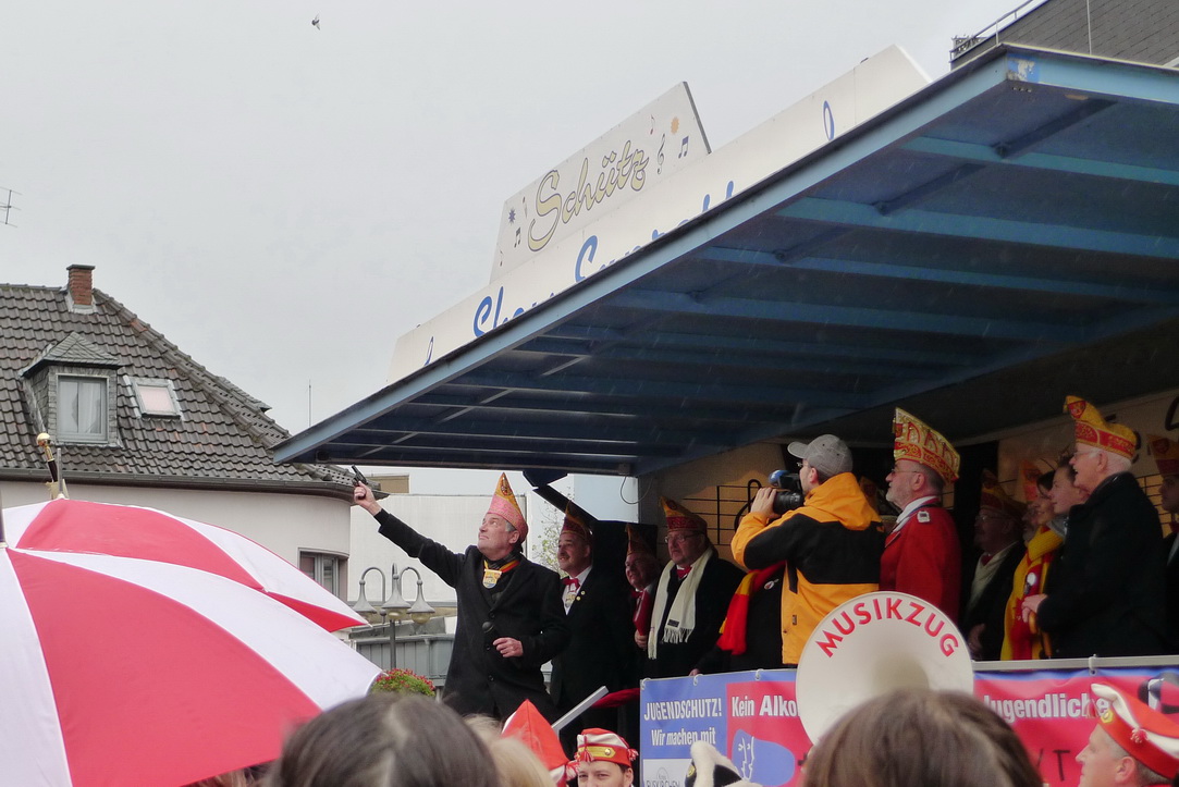 Bild DRK SP | Am Alten Markt herrschte trotz suboptimalen Wetters gute Stimmung. Links in Roter Jacke auf dem Wagen: Erwin Doppelfeld, sowohl Vorstandsvorsitzender des Roten Kreuzes in Euskirchen, als auch aktiver Karnevalist...