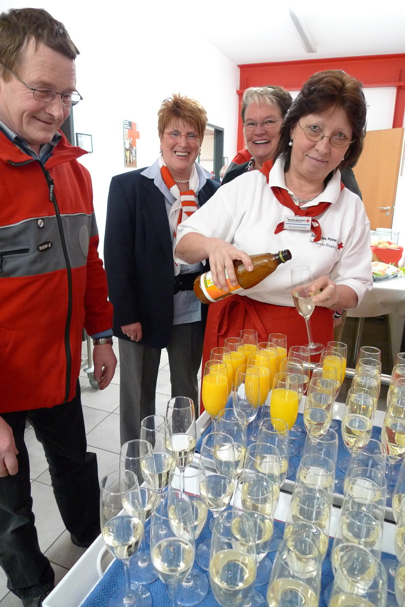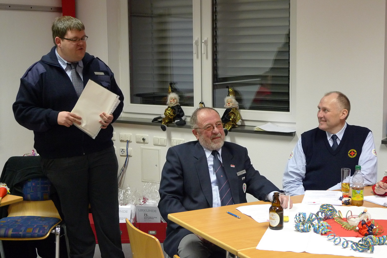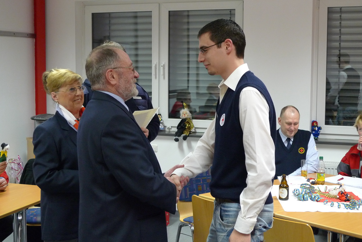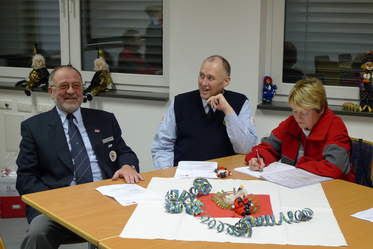 Dirk Bergheim und Jan Rütze sind seit fünf Jahren dabei. Edeltraud Engelen seit zehn und Marco Vogt seit zwanzig Jahren. Großen Beifall der Versammlung erhielt auch Angelika Schmitz, die schon seit 35 Jahren ihren ehrenamtlichen Dienst im Roten Kreuz leistet. Für ihren Einsatz in der Prager Botschaft im Jahr 1989 wurde ihr in Berlin das Bundesverdienstkreuz verliehen.