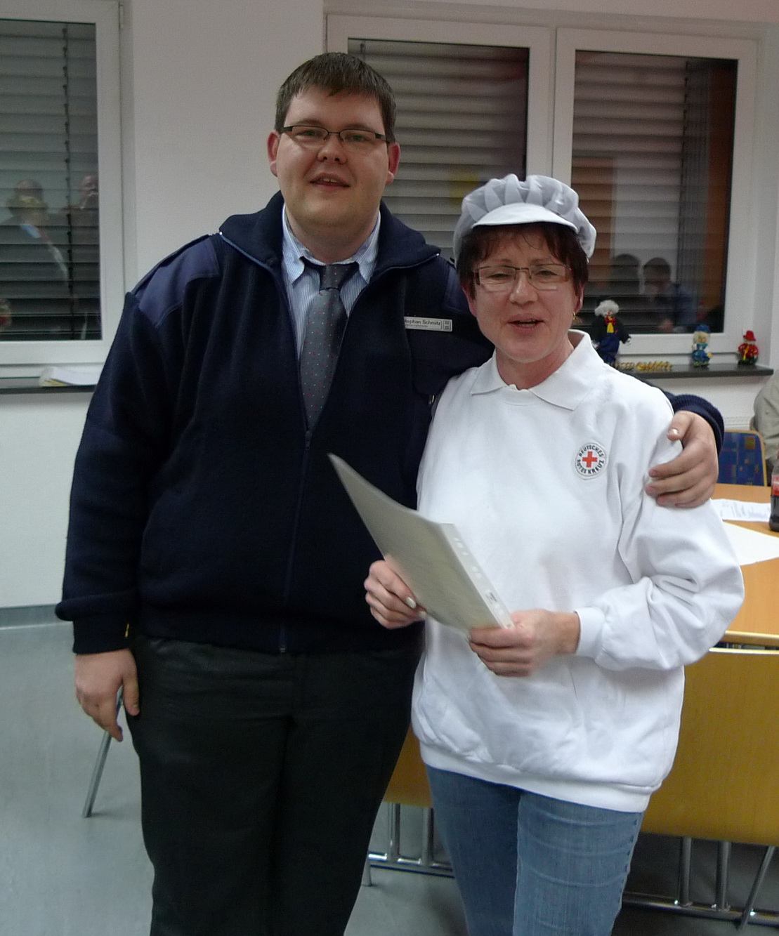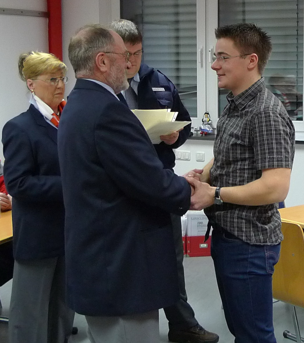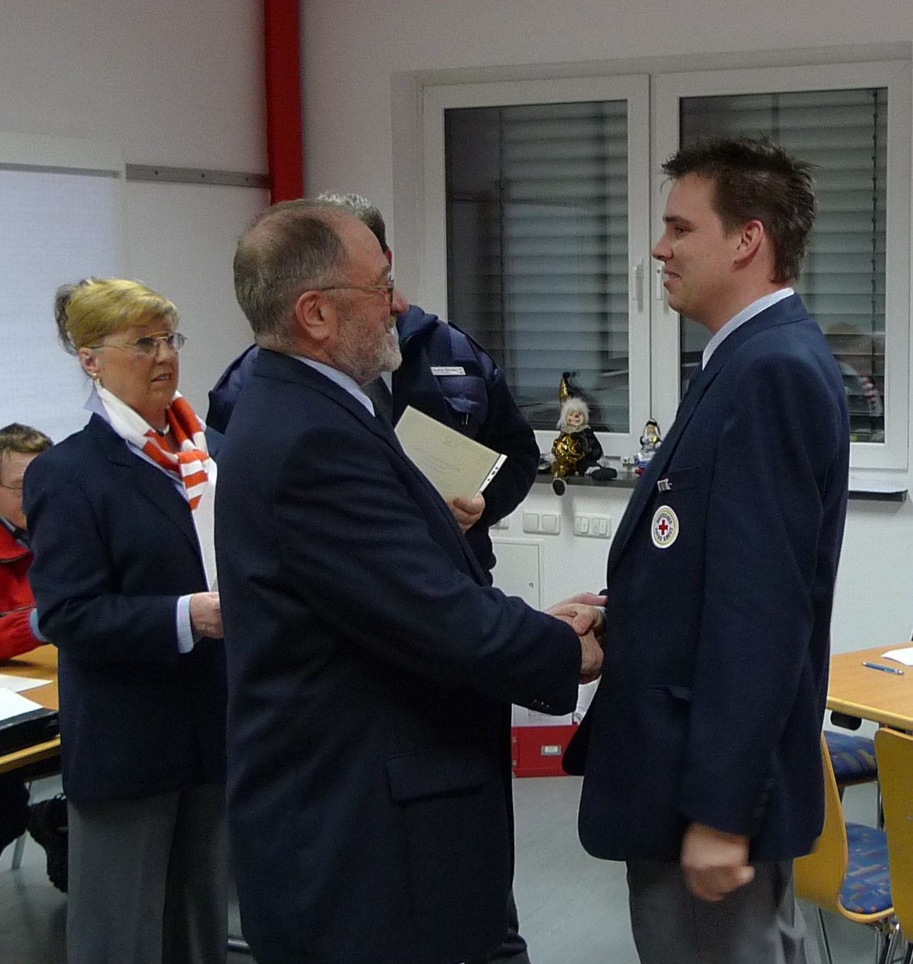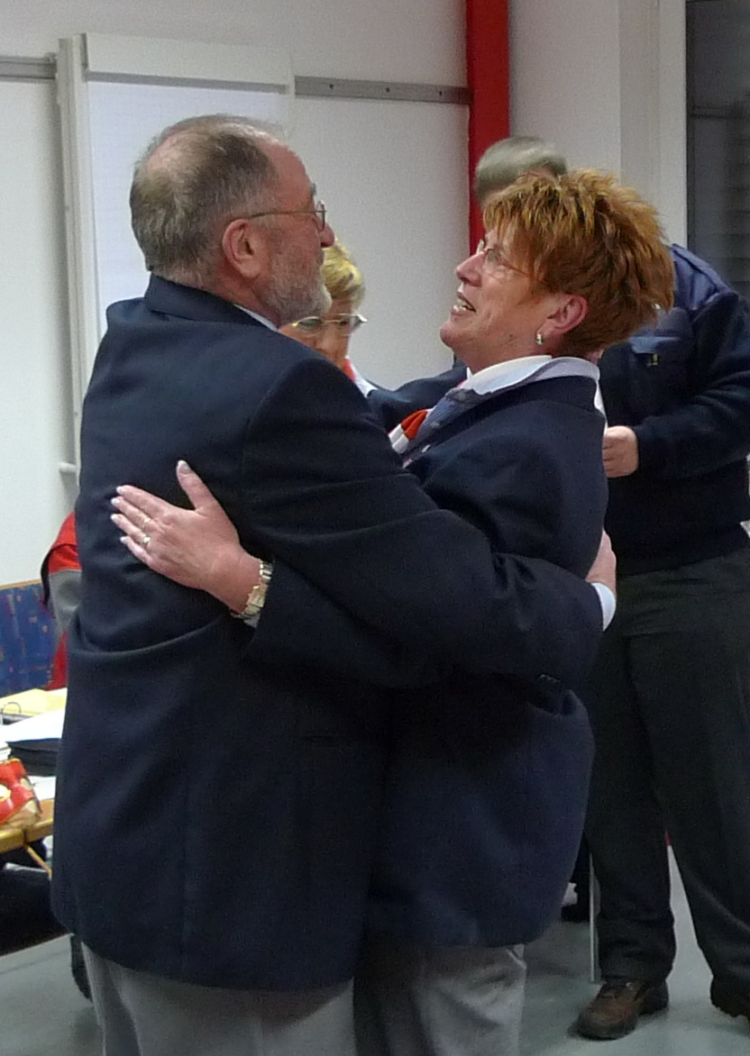Dirk Bergheim und Jan Rütze sind seit fünf Jahren dabei. Edeltraud Engelen seit zehn und Marco Vogt seit zwanzig Jahren. Großen Beifall der Versammlung erhielt auch Angelika Schmitz, die schon seit 35 Jahren ihren ehrenamtlichen Dienst im Roten Kreuz leistet. Für ihren Einsatz in der Prager Botschaft im Jahr 1989 wurde ihr in Berlin das Bundesverdienstkreuz verliehen.
