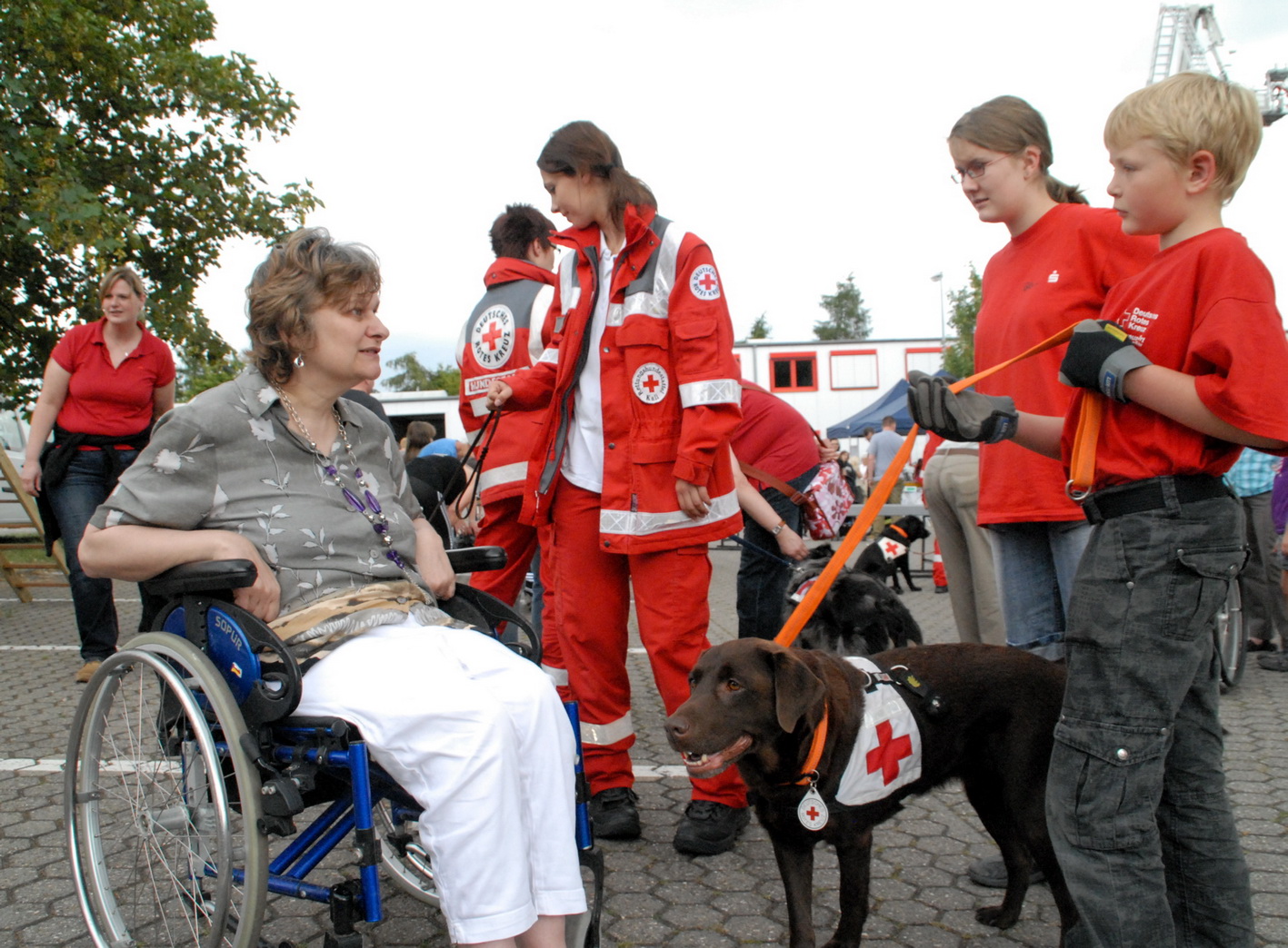 Nicht weniger Aufmerksamkeit wurde dem nachmittäglichen Auftritt der Rotkreuz-Rettungshundestaffel zuteil. Moderiert von Leiter Franz Küpper, zeigten die Mensch-Hund-Teams die Ergebnisse der intensiven wöchentlichen Ausbildung: Die vierbeinigen Retter balancierten über Leitern und Bretter, krochen durch eine Röhre und ließen sich - Omas Nerzkragen gleich - auf den Schultern ihrer Führer tragen. Zum krönenden Abschluss sprangen einige der Hunde sogar durch einen brennenden Reifen. Die beeindruckende Vorführung honorierten die begeisterten Zuschauer mit kräftigem Beifall, danach standen Zwei- und Vierbeiner für Fragen und Streicheleinheiten zur Verfügung.