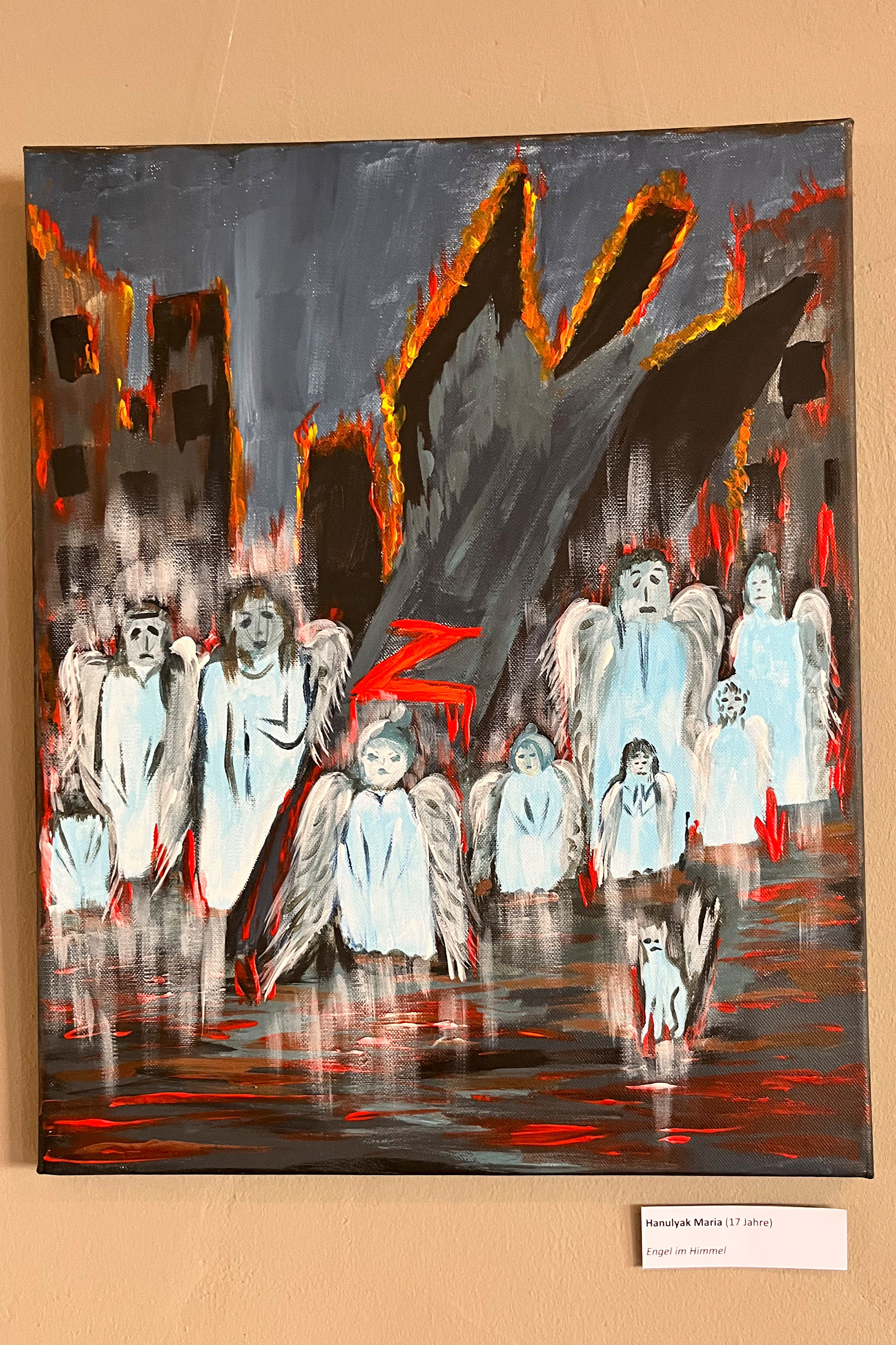 Und dann das: Brennende Häuser. Eine mörderische Rakete. Erwachsene, Kinder und Haustiere werden zu Engeln gemacht. Ein düsteres Bild, mit dem die 17-jährige Maria Hanulyak die Ausstellungsbesucher im Mehrgenerationenhaus des DRK sofort in die furchtbare Realität des Ukraine-Krieges katapultiert. Es ist ein unfassbar harter Kontrast. Ein Kontrast zwischen Traum und Traumata, der diese Ausstellung, die jetzt im Café Henry eröffnet wurde, ausmacht.