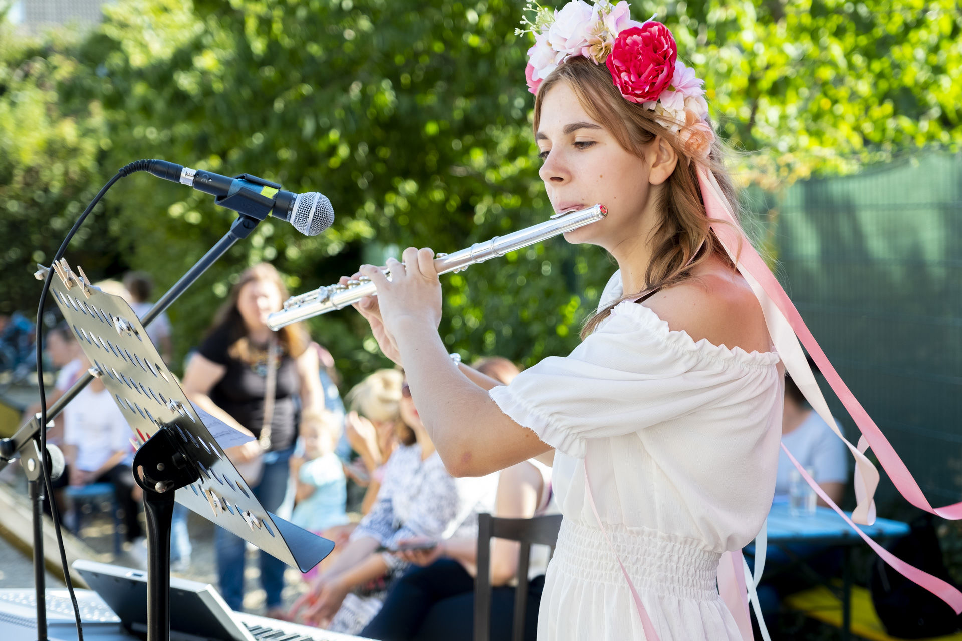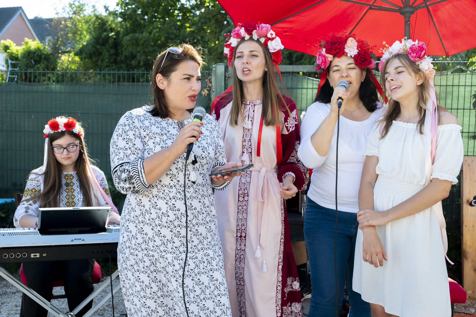Die Kunstlehrerin war sichtlich gerührt und wurde mit langanhaltendem Applaus der begeisterten Besucherinnen und Besucher bedacht. Die genossen allesamt bei herrlichem Sonnenschein den Nachmittag im Café Henry. Zu Speis und Trank gab es im Außenbereich des Cafés ein abwechslungsreiches musikalisches Programm. Yana Prozorova, Oksana Starytska, die auch Gitarre spielte, und Katharina Tkach begeisterten mit Gesangseinlagen. Begleitet wurden sie dabei von Renata Vovk am Keyboard. Beeindruckend war auch der Auftritt von Polina Starytska an der Querflöte. Als sie spielte, wurde es ganz leise im Außenbereich.