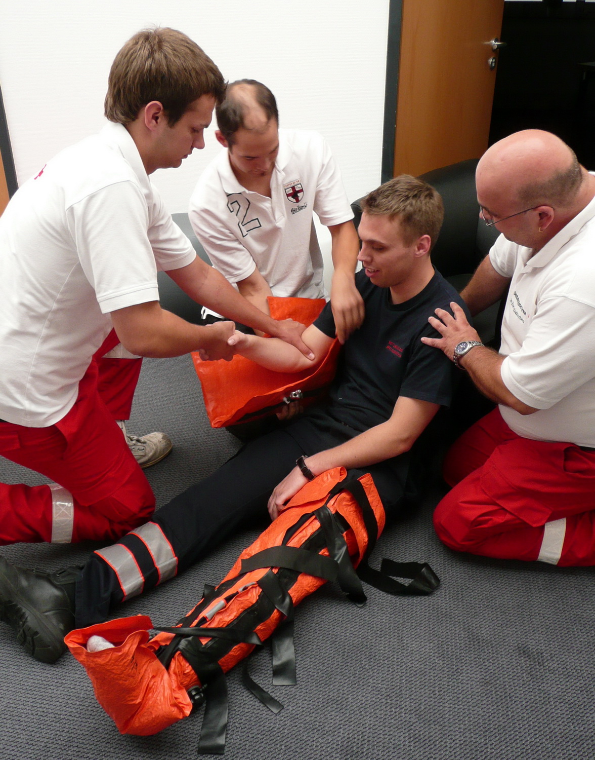 "Katrin Erden erarbeitete mit den motivierten Teilnehmern das richtige Vorgehen bei verunfallten Personen", sagt Dirk Rose. So waren auch das Anlegen von KED Systemen (Rettungskorsett bei Wirbelsäulenverletzungen) nach Unfällen oder von Schienen bei einem Beinbruch Themen der Fortbildung.
