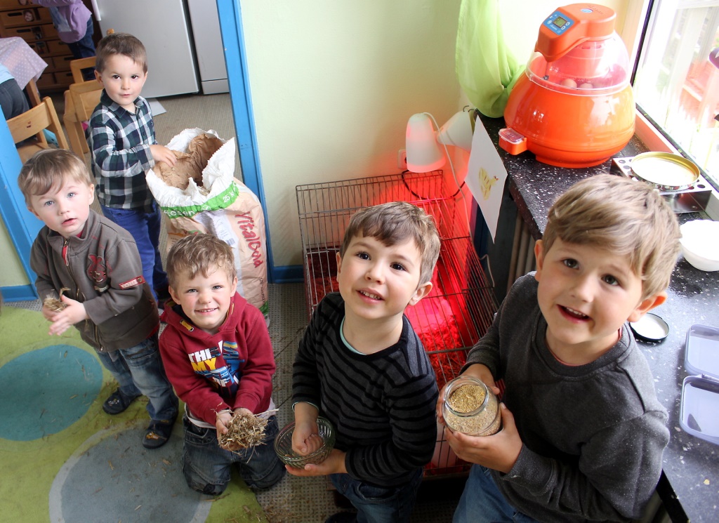 Weil es nun richtig losgeht und alle – die Eltern eingeschlossen – ganz gespannt sind, wird die Kita ausnahmsweise auch am Wochenende eine Stunde geöffnet sein. Die Pädagoginnen, das sind neben Pia Huppertz noch die Kitaleiterin Julia Jakobs und die Erzieherin Sonja Kirchner, übernehmen den zusätzlichen Dienst freiwillig, auch die Betreuung der Küken an allen anderen Wochenendtagen, denn: „Wenn die Küken getrocknet sind, spätestens aber nach 24 Stunden, müssen sie aus dem Brutkasten genommen werden und ziehen um“, so Pia Huppertz. Die „neue Wohnung“ für den Hühnernachwuchs haben die Kinder bereits eingerichtet und mit Stroh ausgelegt: Ein kleiner Hühnerstall, der sich nun langsam füllen und für zwei Wochen im Gruppenraum stehen wird.