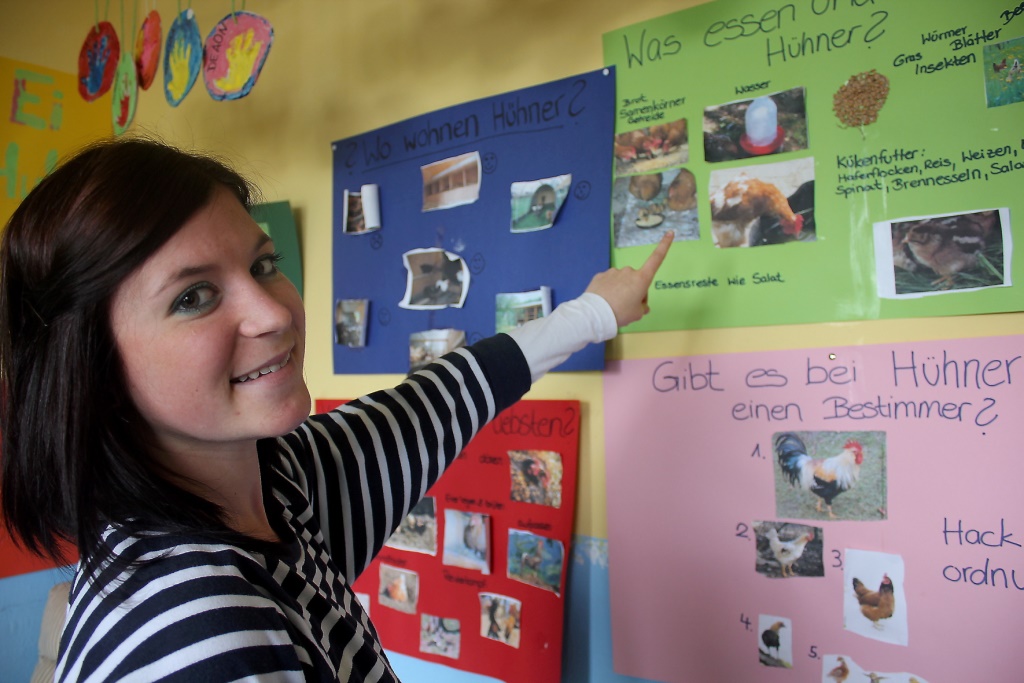 Dann können die Kinder vielleicht einiges von dem beobachten, was sie gelernt haben: „Hühner machen »pip, pip«, aber sie sprechen auch mit ihrem Körper“, weiß die fünfjährige Mona. Moritz (3) erklärt, das könne beispielsweise sein, wenn sie nacheinander picken oder - als eine Art „Entschuldigung“ - den Kopf einziehen und sich mit gehobenen Flügeln wegdrehen. Mike (4) fasst zusammen: „Hühner zanken sich auch öfter mal.“