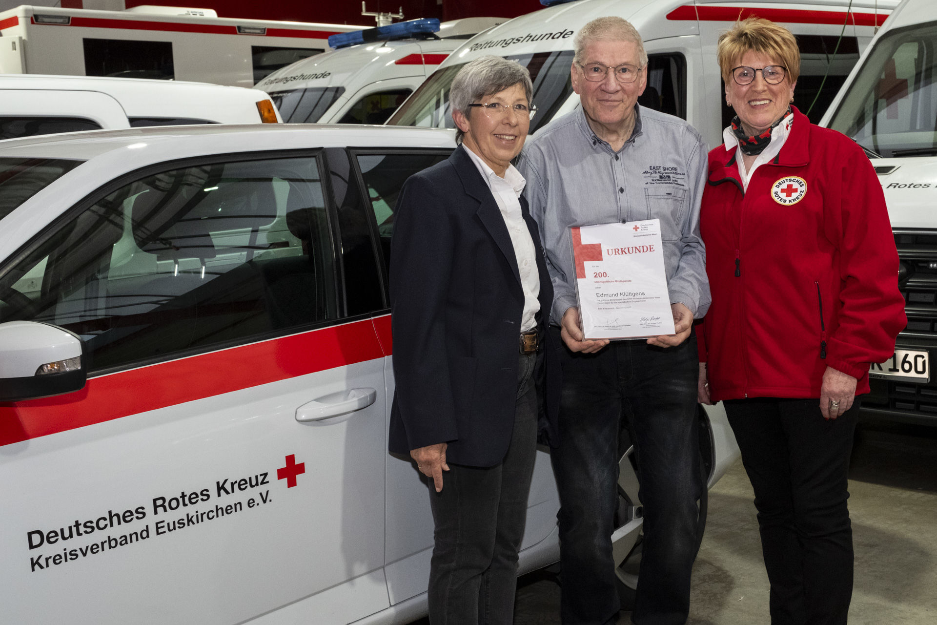 Euskirchen – Das Gruppenfoto in der Wagenhalle des Euskirchener DRK ist gemacht, da unterhält sich Edmund Klüntgens noch kurz mit der Euskirchener Ortsvereins-Vorsitzenden Angelika Gräber-Stupp und der Blutspendebeauftragten Edeltraud Engelen. „Ich mache weiter“, sagt der Blankenheimer im Brustton der Überzeugung. Weiter bedeutet, dass er noch deutlich mehr Blutspenden schaffen möchte, als die 200, für die er an diesem Abend ausgezeichnet worden ist.