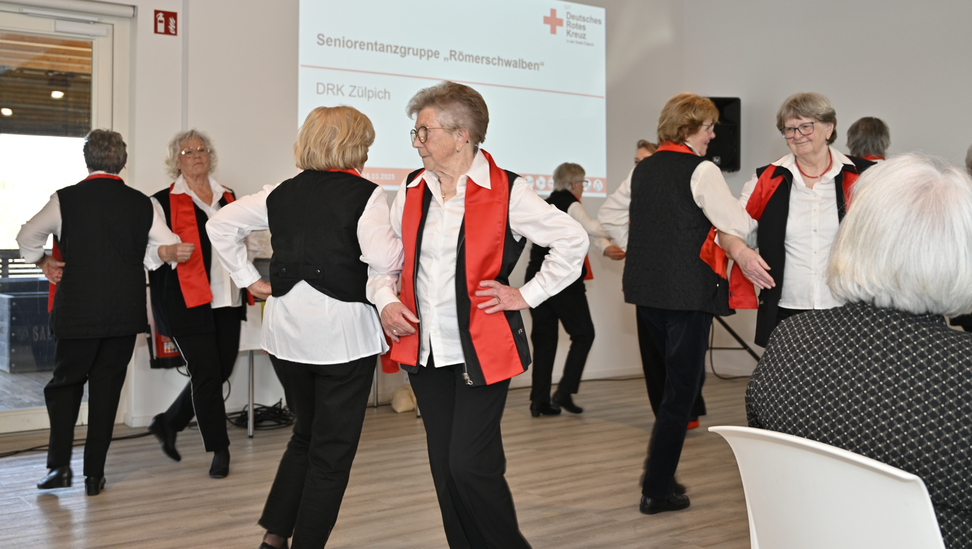 Neben kreativen Kurzfilmen vom französischen und österreichischen Roten Kreuz und Grußworten von Bereitschaftsleiter Thomas Heinen, dem Ortsvereinsvorsitzenden Lothar Henrich, dem Kreisverbandsvorsitzenden Karl-Werner Zimmermann und dem stellvertretenden Bürgermeister André Heinrichs, trat zunächst die vereinseigene Seniorentanzgruppe „Römerschwalben“ zu „Day-O“ von Harry Belafonte oder irischen Klängen von Angelo Kelly auf. Die geübten Damen hatten sichtlich Spaß, der sich schnell auf die Anwesenden übertrug.