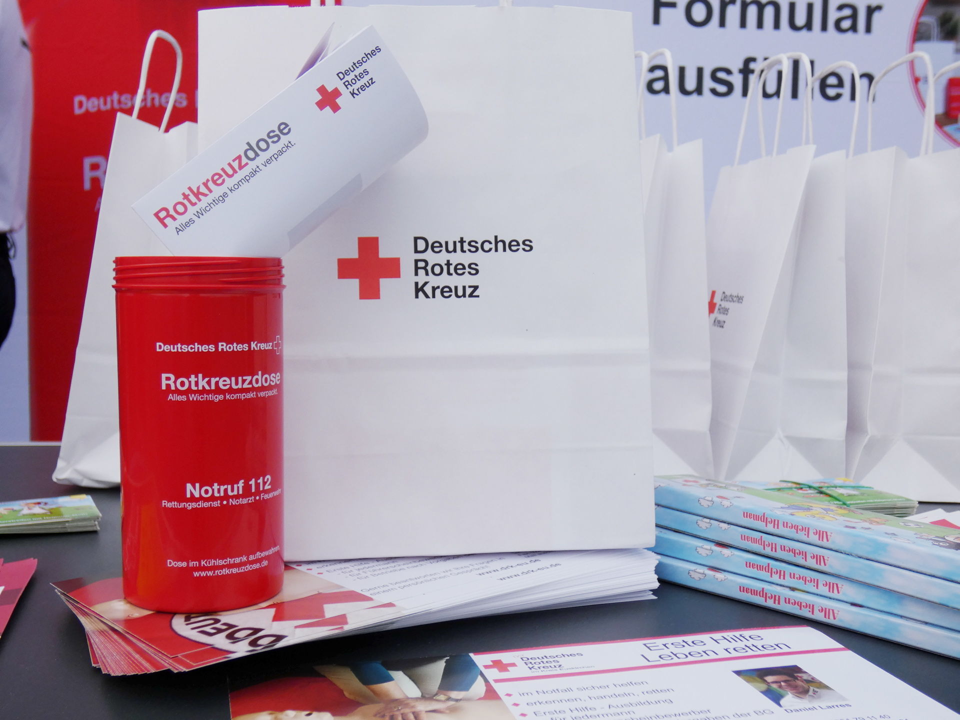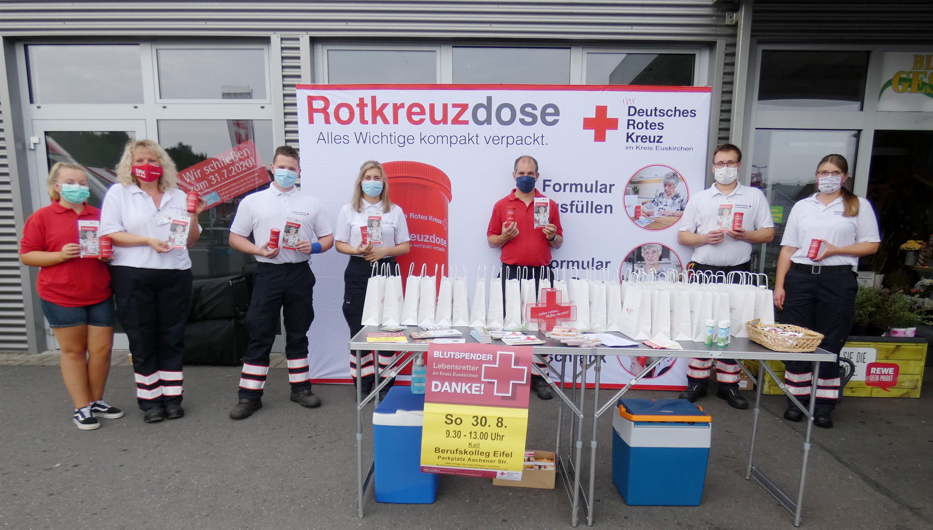 Rotkreuzler machten vor dem Kaller REWE-Markt auf Hilfe im Notfall aufmerksam, die im Kühlschrank deponiert wird