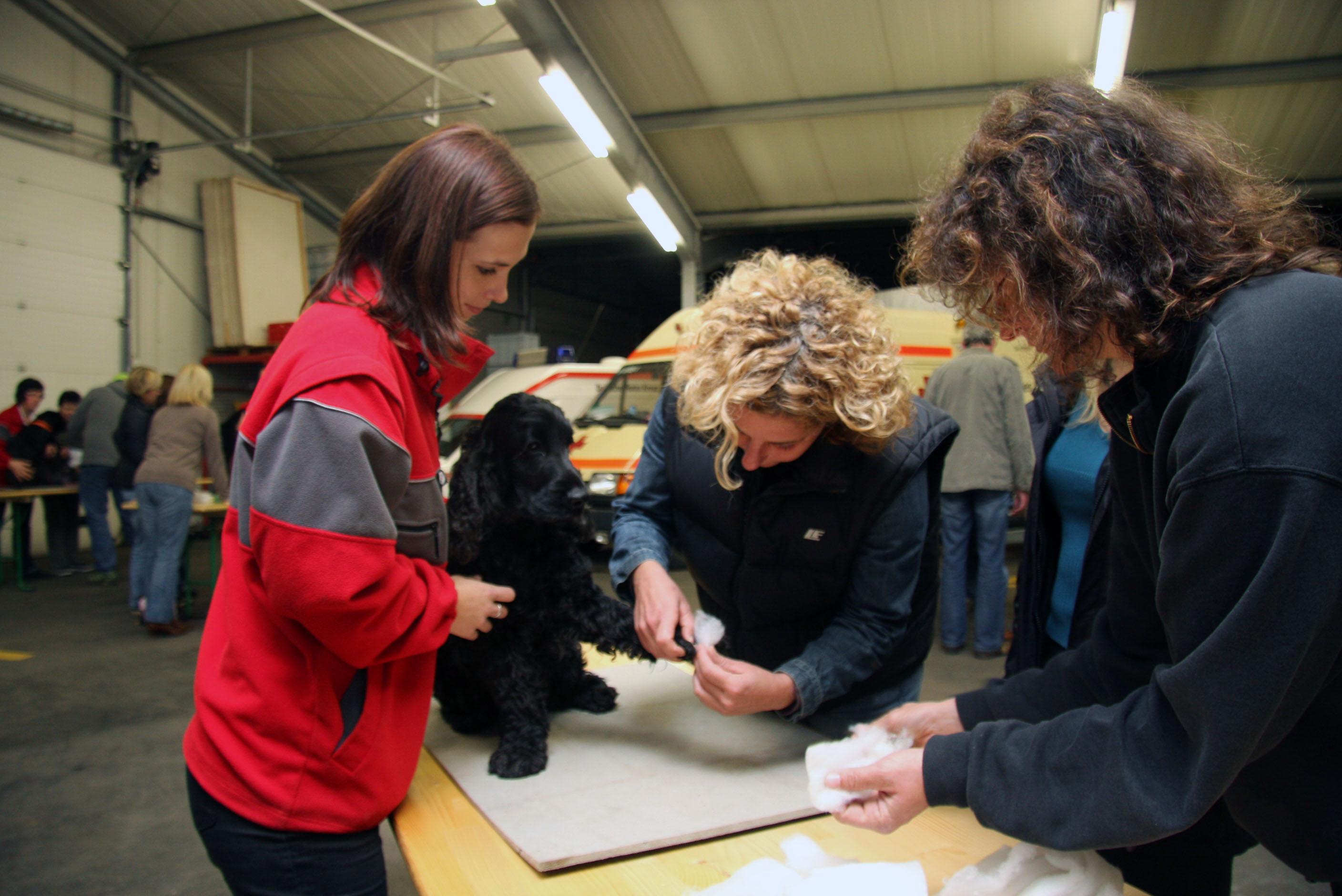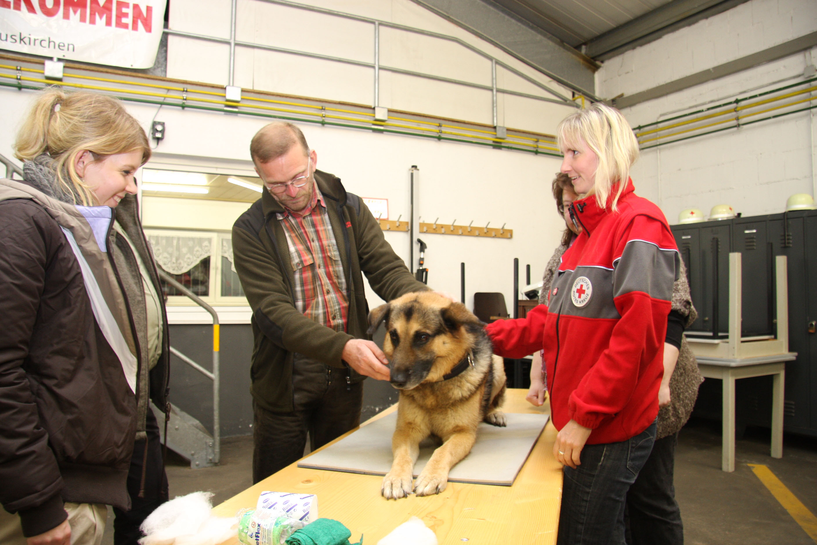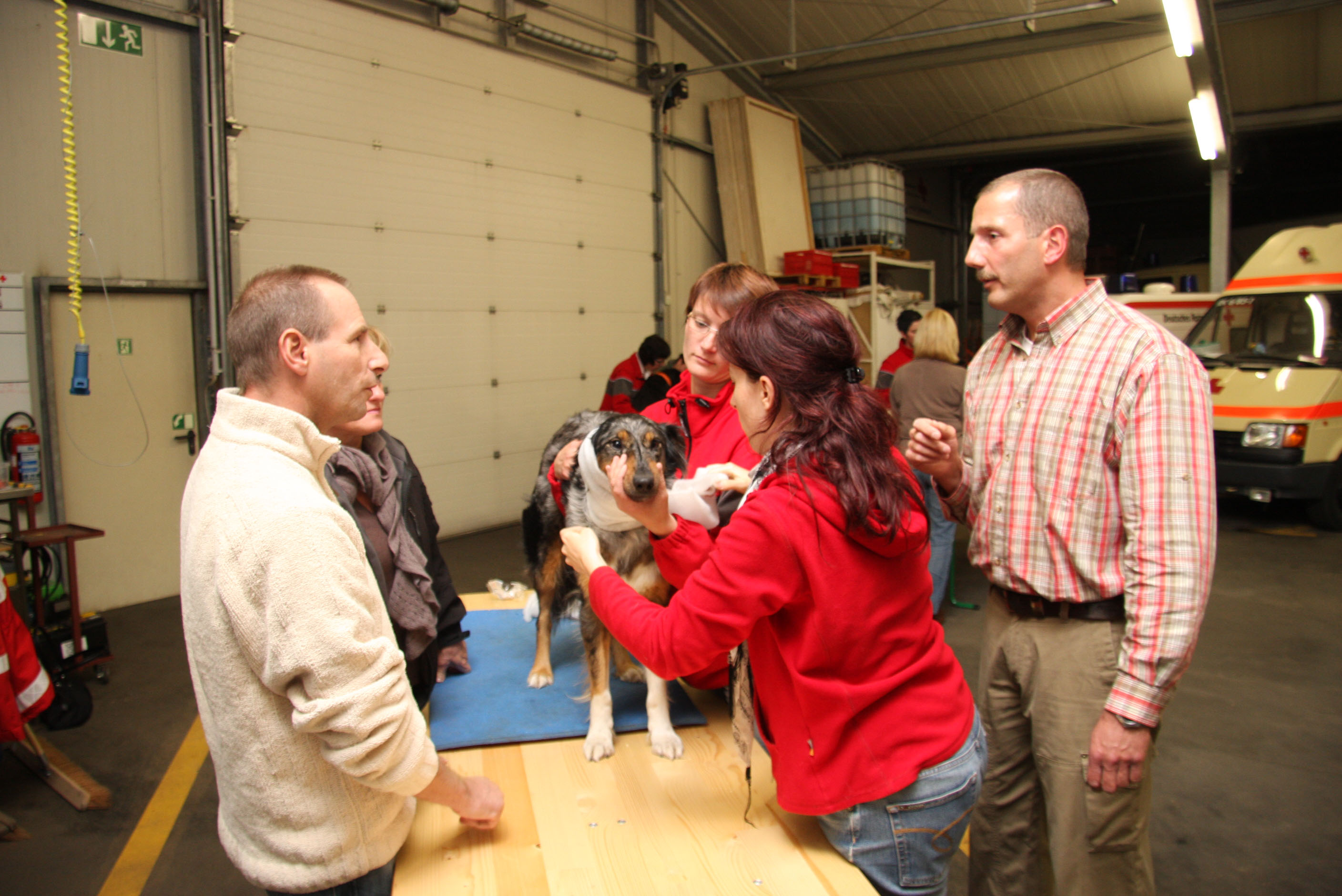 Kall - Im Kaller Rotkreuz-Zentrum vermittelte Tierarzt Dr. Bert Hülsmann aus der Kommerner Praxis „Dres. Stockem und Hülsmann“ äußerst fachkompetent und für Jedermann verständlich Erste Hilfe bei Verletzungen ebenso wie Untersuchungs- und Gewöhnungsübungen: Ruhigstellen einer Gliedmaße, Fixieren des Hundes für bestimmte Untersuchungen, Untersuchung von Ohr und Auge, Temperaturmessung, Behandlung von Verletzungen der Haut, Blutstillung, Wundreinigung und Desinfektion waren nur ein Teil des Lehrgangs. Verbände und Wundschutz waren ebenso ein Thema wie Krämpfe und Anfälle, Magendrehung, Schock, Insektenstiche, Unterkühlung und Erfrierungen, Hitzschlag und Sonnenstich.